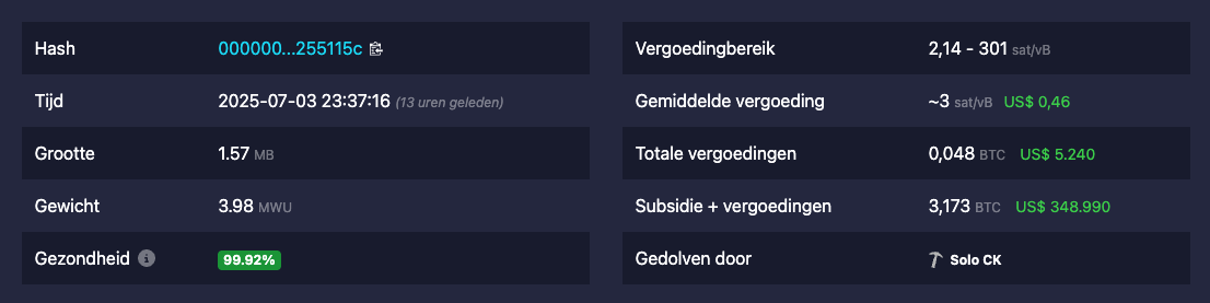 Volgens Bitcoin-historicus Pete Rizzo ging het om een “ongelooflijke kans” die werkelijkheid werd. De gelukkige miner wist op donderdag blok 903883 op te lossen en kreeg daarvoor 3,173 BTC aan beloning, zo blijkt uit gegevens van Mempool Space. De beloning bestaat uit de standaard block reward en bijbehorende transactiekosten.