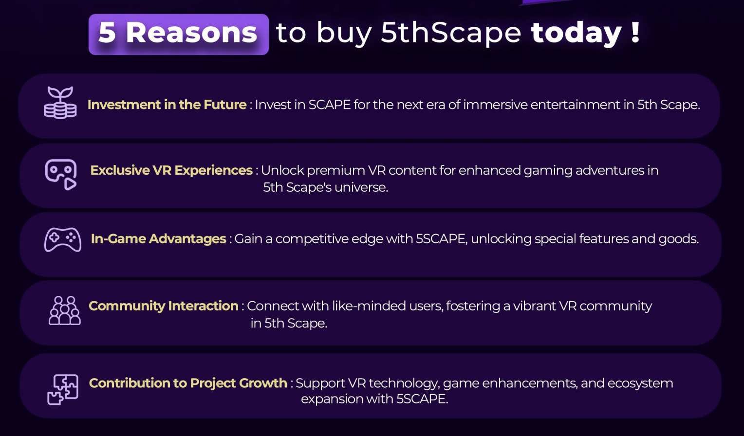 Dit betekent dat vroege investeerders het meeste voordeel hebben, aangezien ze instappen tegen lagere koersen. Samengevat introduceert 5th Scape een vernieuwende benadering van de VR-wereld, met de ambitie om de grenzen van mogelijkheden te verleggen door middel van hun geïntegreerde ecosysteem.