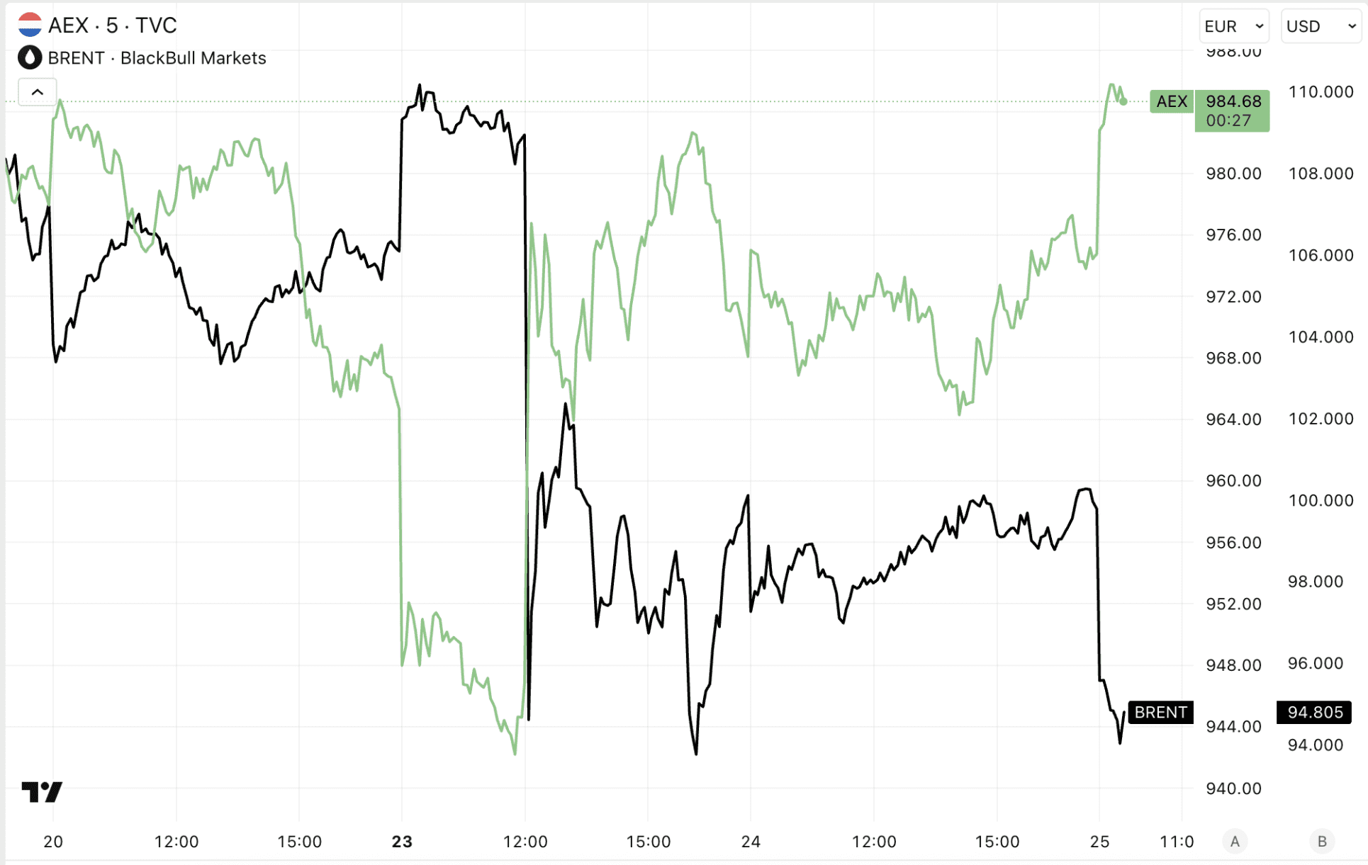 In de grafiek hieronder zien we dat de sprong van de AEX bijna spiegelt met de koersdaling voor olie. De markt begint wat optimistischer te worden, maar vergeet niet dat we dergelijke dalingen van de olieprijs vaker zagen de afgelopen weken.