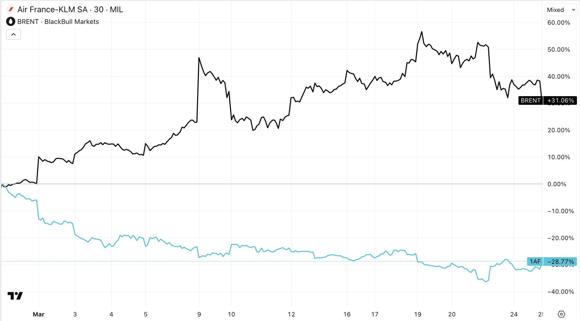 Ondanks die stijging staat er over het hele conflict gemeten nog steeds een daling van bijna 30 procent op de borden voor KLM.