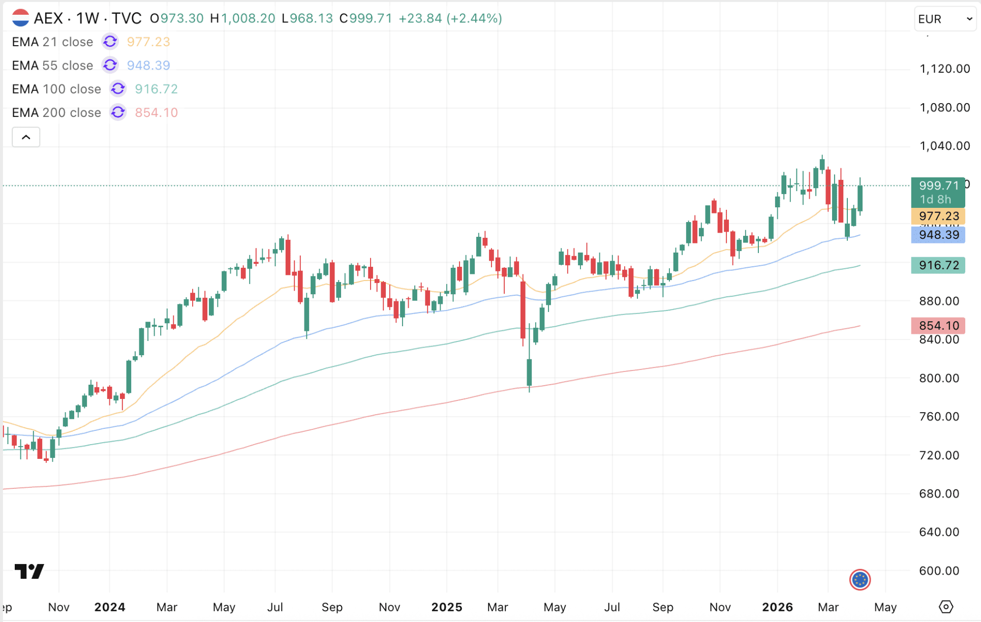 Hoewel de koers vandaag enigszins is teruggevallen, wist de AEX zich gedurende de periode van onzekerheid behoorlijk sterk te houden. De beursindex is niet onder het 55-weekse exponentiële koersgemiddelde gekomen (blauw).