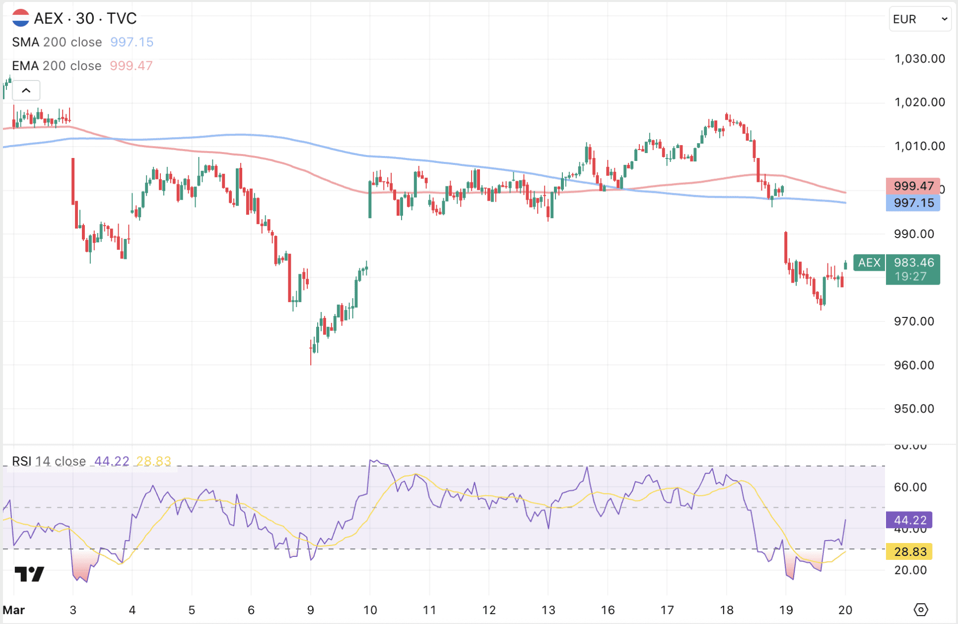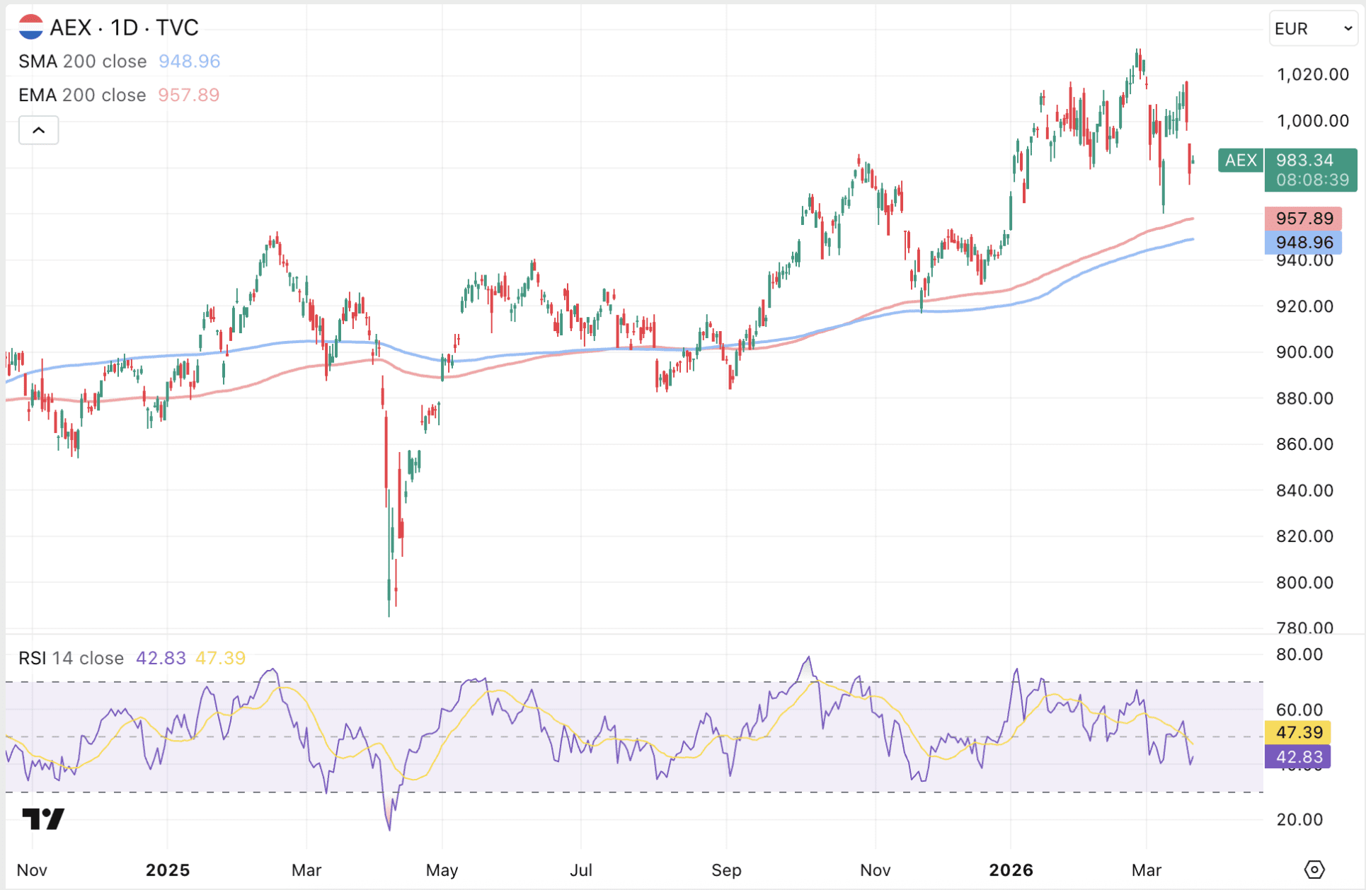 Het zijn volatiele dagen op de beurs en daar kan ook de Nederlandse AEX niet aan ontsnappen. Terwijl gisteren nog een lokale bodem van ongeveer 972 punten werd aangetikt, handelt de AEX nu alweer op 983 punten. Daarmee nadert opnieuw de symbolische grens van 1.000 punten voor de beursindex.