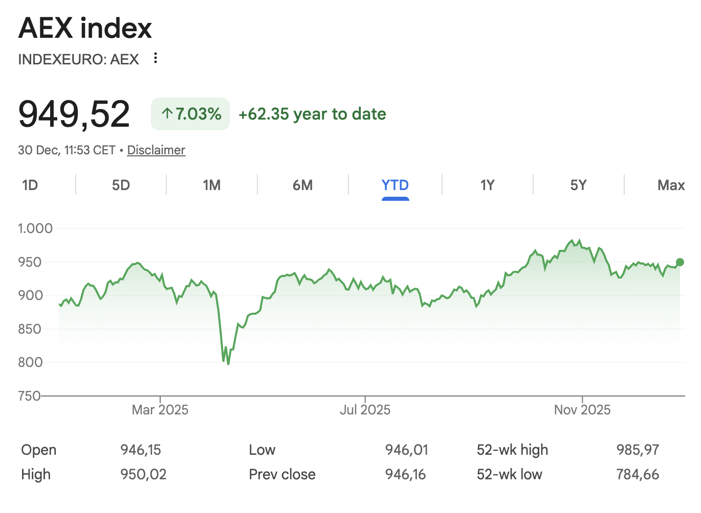 De Nederlandse AEX kende een wisselvallig 2025. Hoewel er nieuwe koersrecords werden behaald, lukt het niet om een echte doorbraak te forceren. Op 24 oktober werd de voorlopige all-time high van 985,97 punten bereikt, en met de huidige koers van 949,52 punten staat er voor dit jaar een rendement van iets meer dan 7 procent.