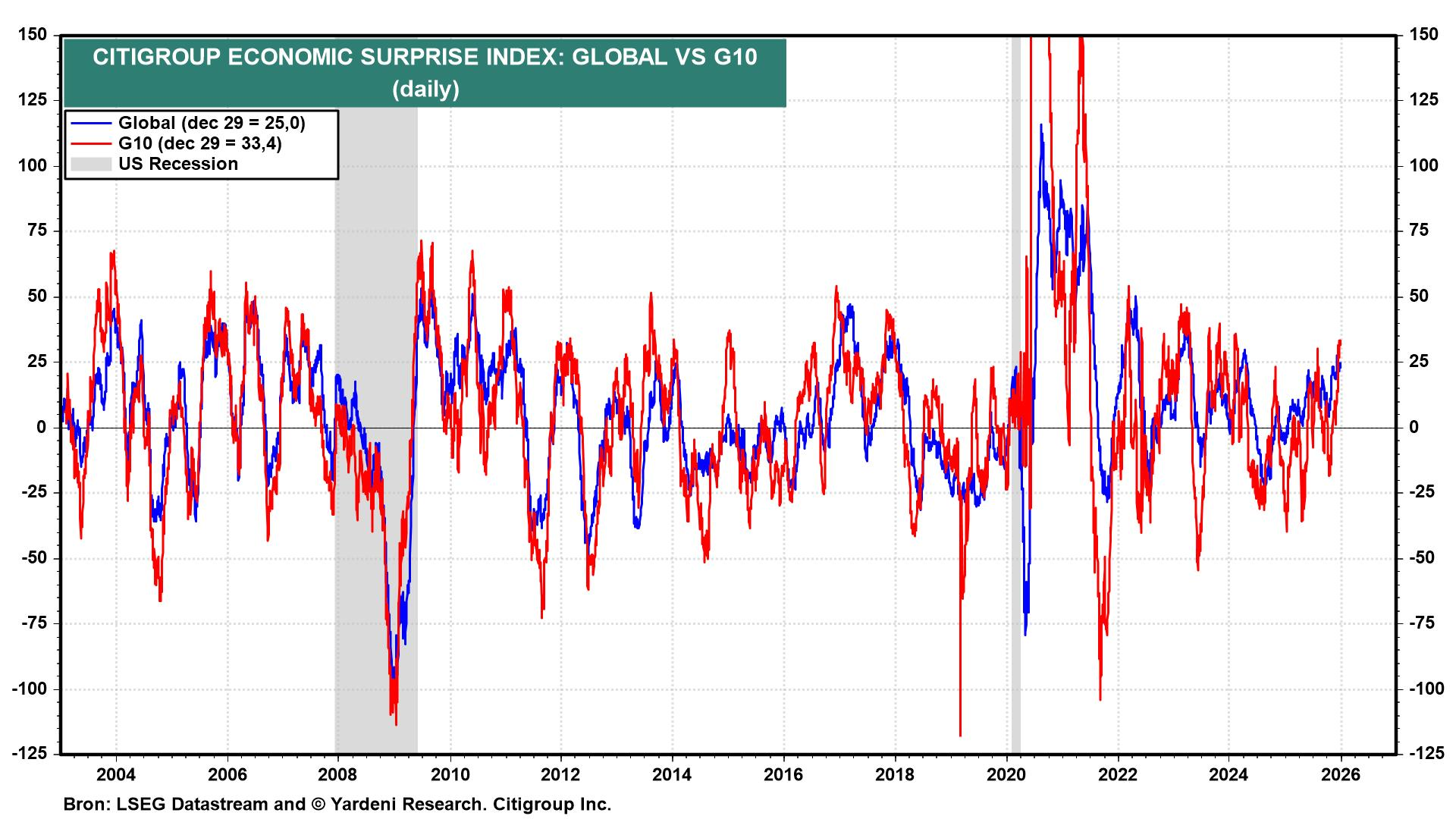 Voorlopig zien we dat de economische cijfers wereldwijd weer positief verrassen. Dat wil zeggen: ze zijn beter dan waar de meeste analisten op hadden gerekend.