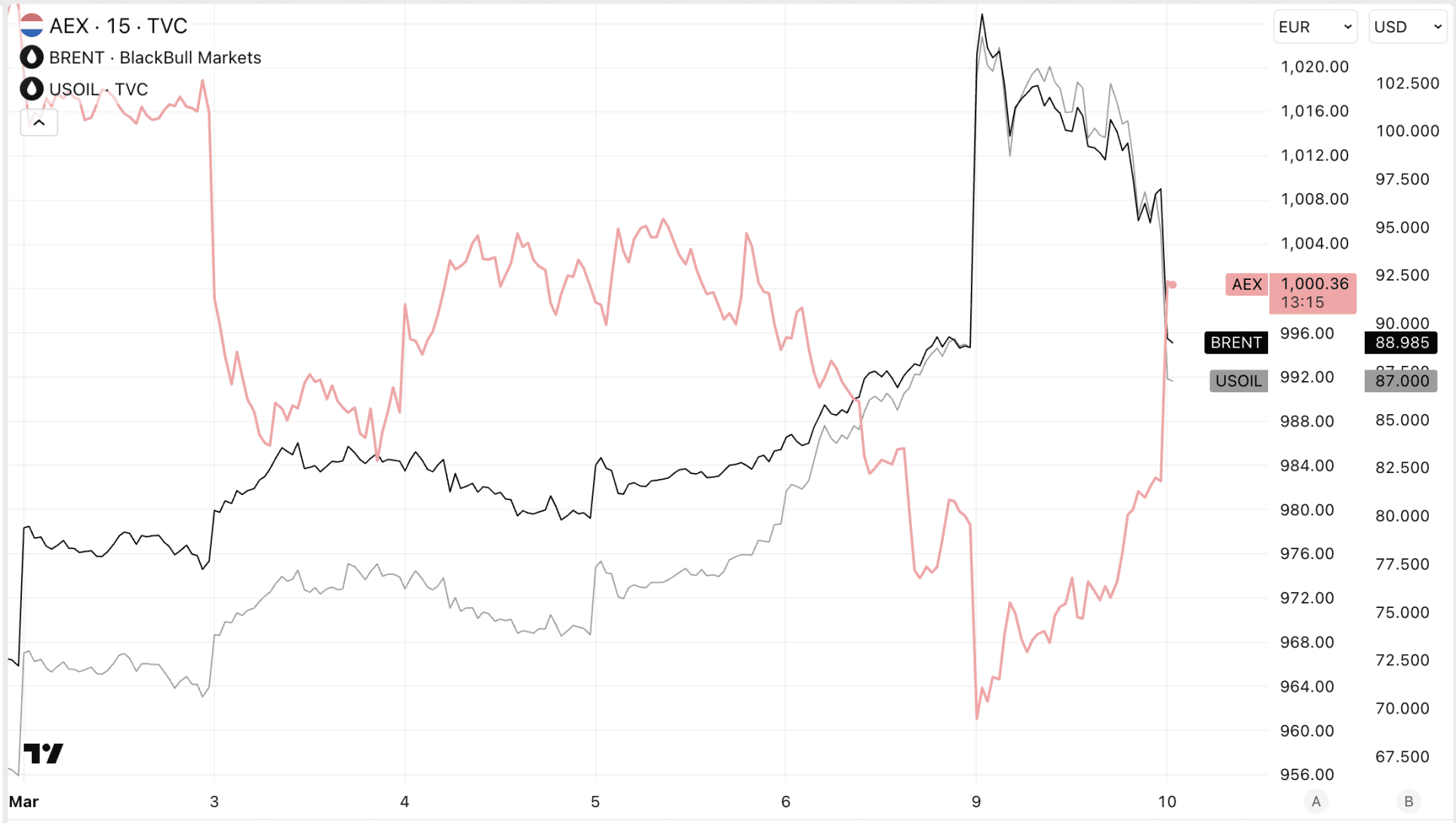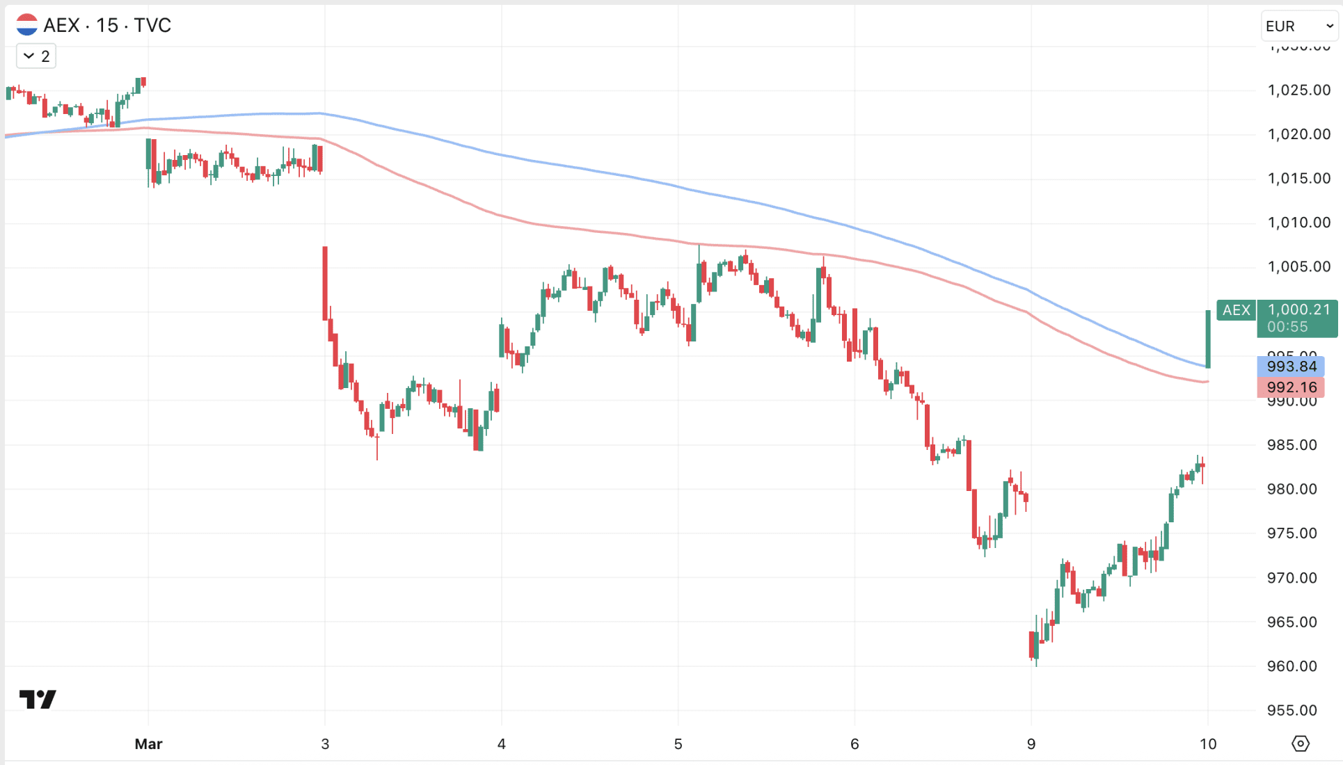 In de eerste week na het Iran-conflict daalde de AEX koers met 6 procent. Uiteindelijk eindigde dat in een voorlopige bodem van ongeveer 960 punten. Vandaag opende de AEX echter met een sprong van bijna 17 punten, omdat Donald Trump gisteravond verkondigde dat de oorlog snel voorbij zou zijn.