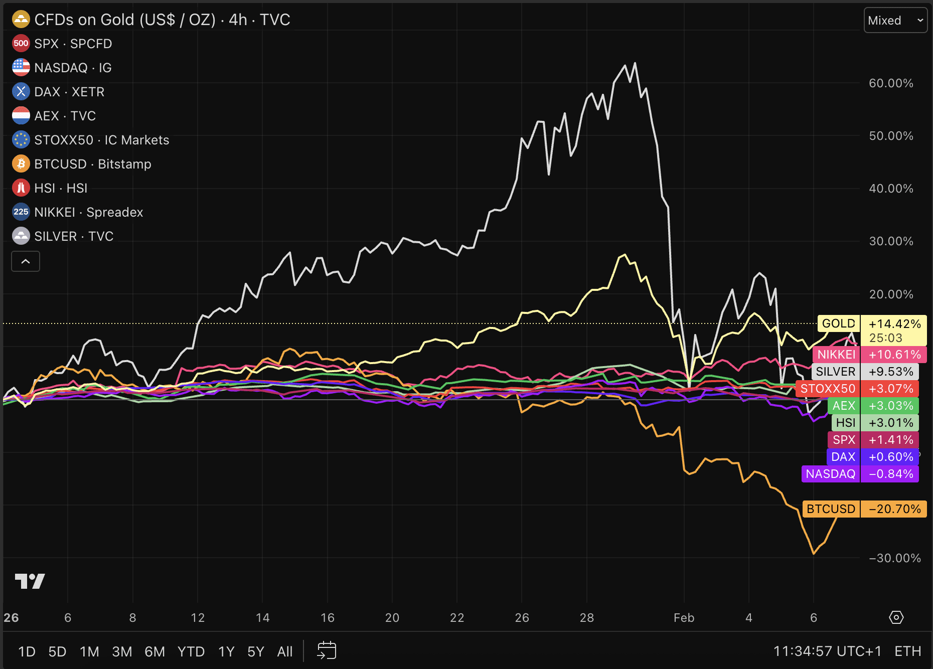 Alleen de Japanse Nikkei 225, zilver en goud doen het nog een stuk beter dan de AEX. Ondanks dat we ook goud en zilver flink zagen corrigeren richting het einde van januari. Het is nog maar de vraag of de edelmetalen-hype van de afgelopen maanden kan doorzetten de komende weken.