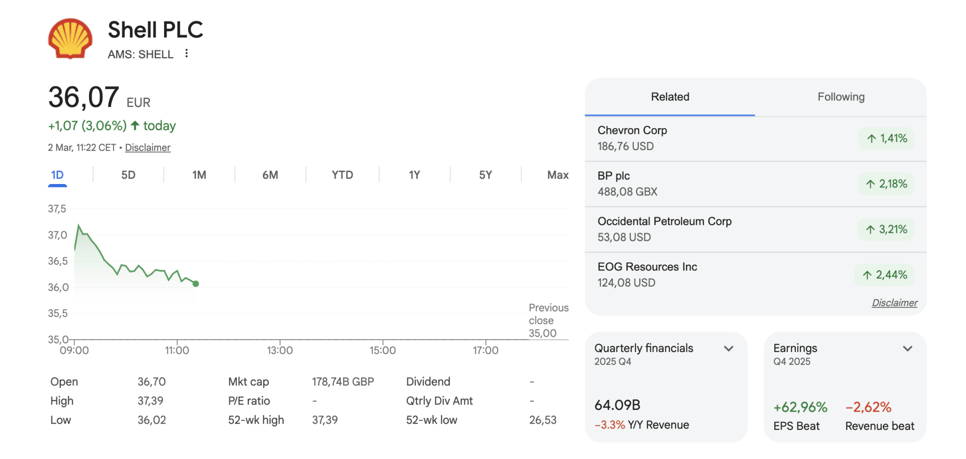 Het lag al in de lijn der verwachting, maar de AEX koers is vandaag een stuk lager geopend door de ontbranding van het conflict in iran. Op het moment van schrijven gaat het om een daling van ongeveer 1 procent voor de beursindex. De daling valt mee, omdat Shell bijvoorbeeld een bedrijf is dat profiteert van de hogere olieprijzen.