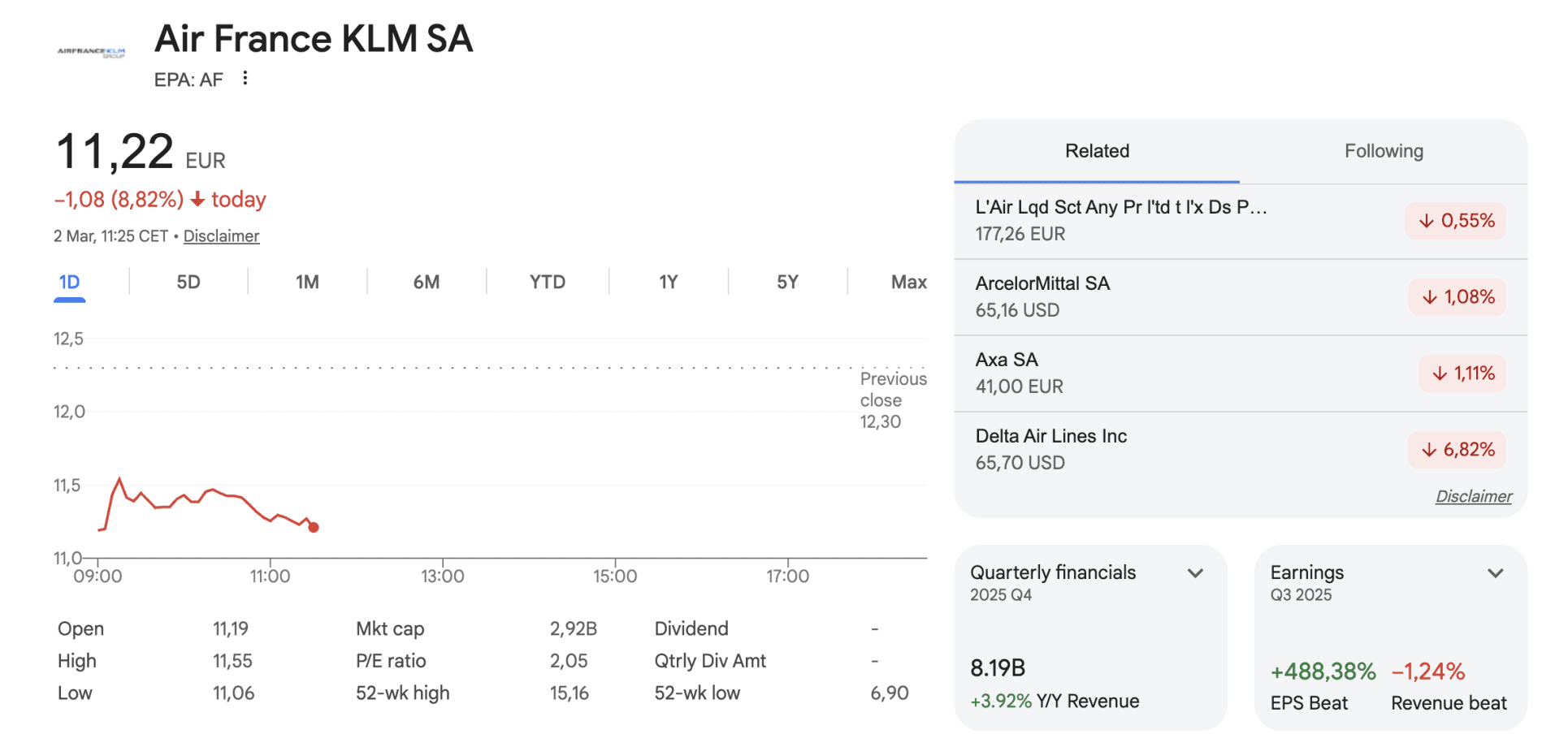 Air France-KLM daalde met ruim 8 procent, terwijl ook andere luchtvaartmaatschappijen het lastig hebben met de ontwikkelingen. Ook dat is niet vreemd, want veel vluchten in het Midden-Oosten gaan de komende tijd niet door. Tot en met 5 maart vliegt KLM niet naar Dubai, Riyad en Dammam.