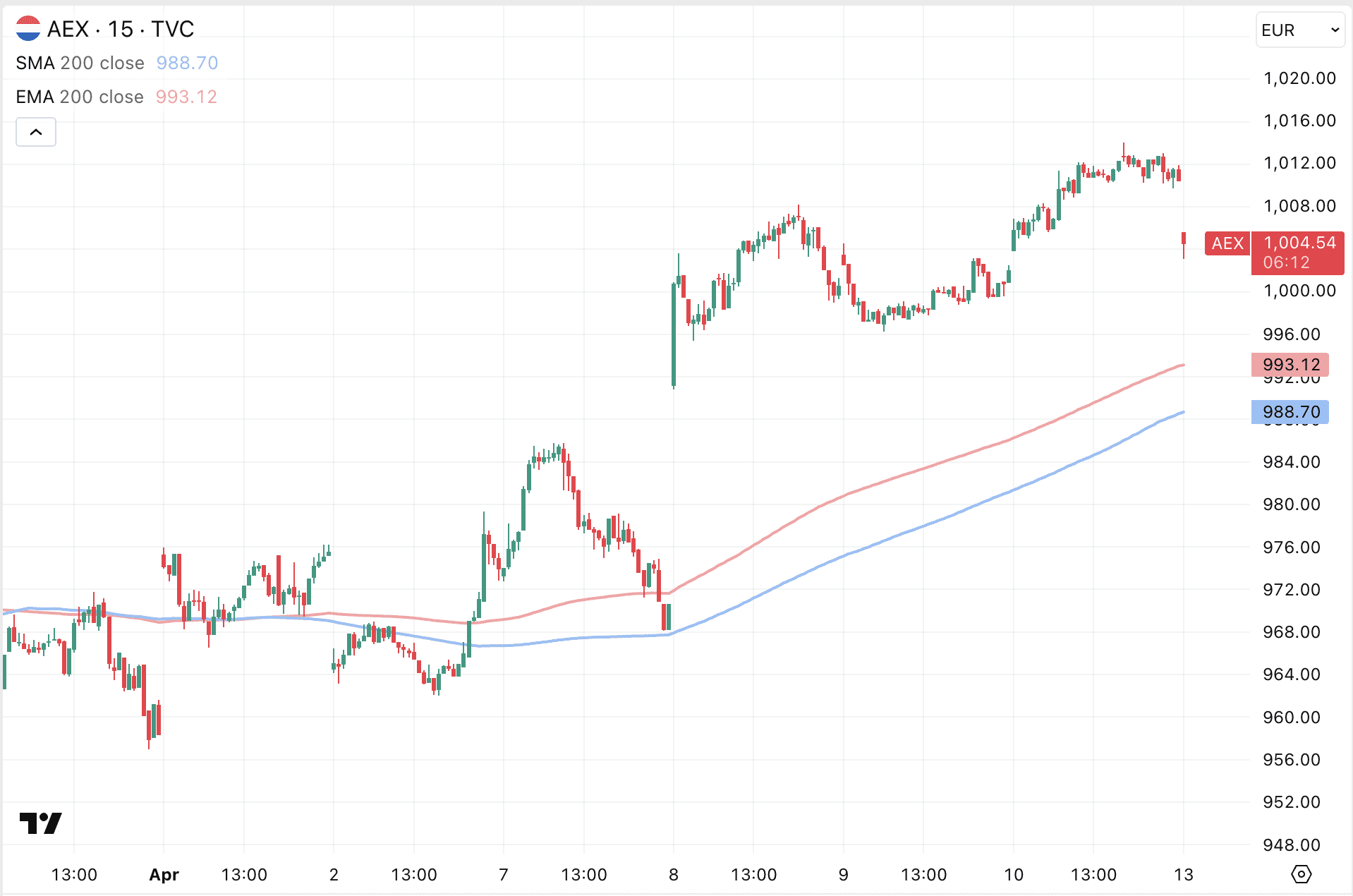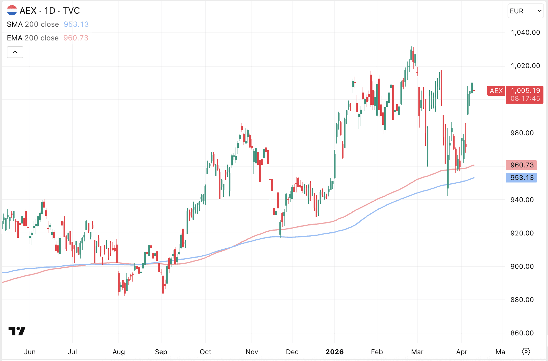 Voorlopig lijkt het 200-daagse koersgemiddelde (blauw) een belangrijke steun te vormen voor de AEX koers. Zolang die steun blijft standhouden, hoeven beleggers zich waarschijnlijk geen zorgen te maken over extreme koersdalingen op de beurs.