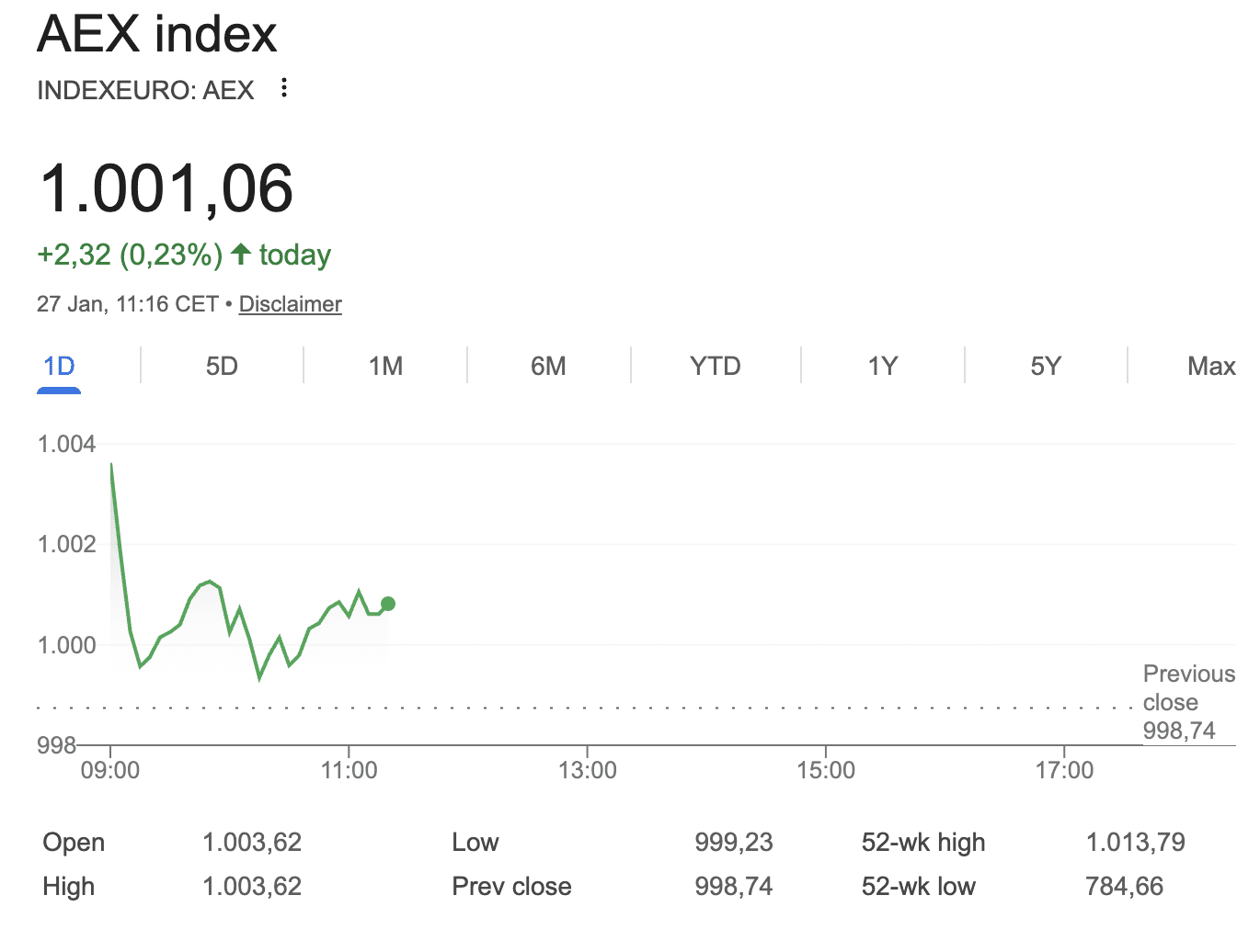 Het is de AEX koers opnieuw gelukt om boven de symbolische grens van 1.000 punten te komen. Toch ontbreekt het duidelijk aan overtuiging. Voor vandaag staat er voorlopig een rendement van 0,23 procent. Waarom lukt het de AEX niet om door te pakken?