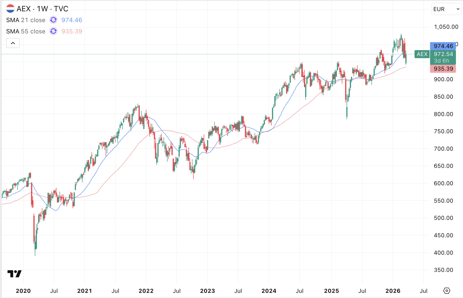 De AEX koers maakt vandaag een lichte stijging door. Op het moment van schrijven noteert de beursindex op 972 punten voor een lichte stijging van 0,55 procent. Die stijging komt, terwijl Donald Trump gisteren een pauze van vijf dagen aankondigde voor de aanvallen op Iran. Ondanks dat blijven de olieprijzen hoog en heeft de markt nog weinig vertrouwen in een definitieve wapenstilstand.