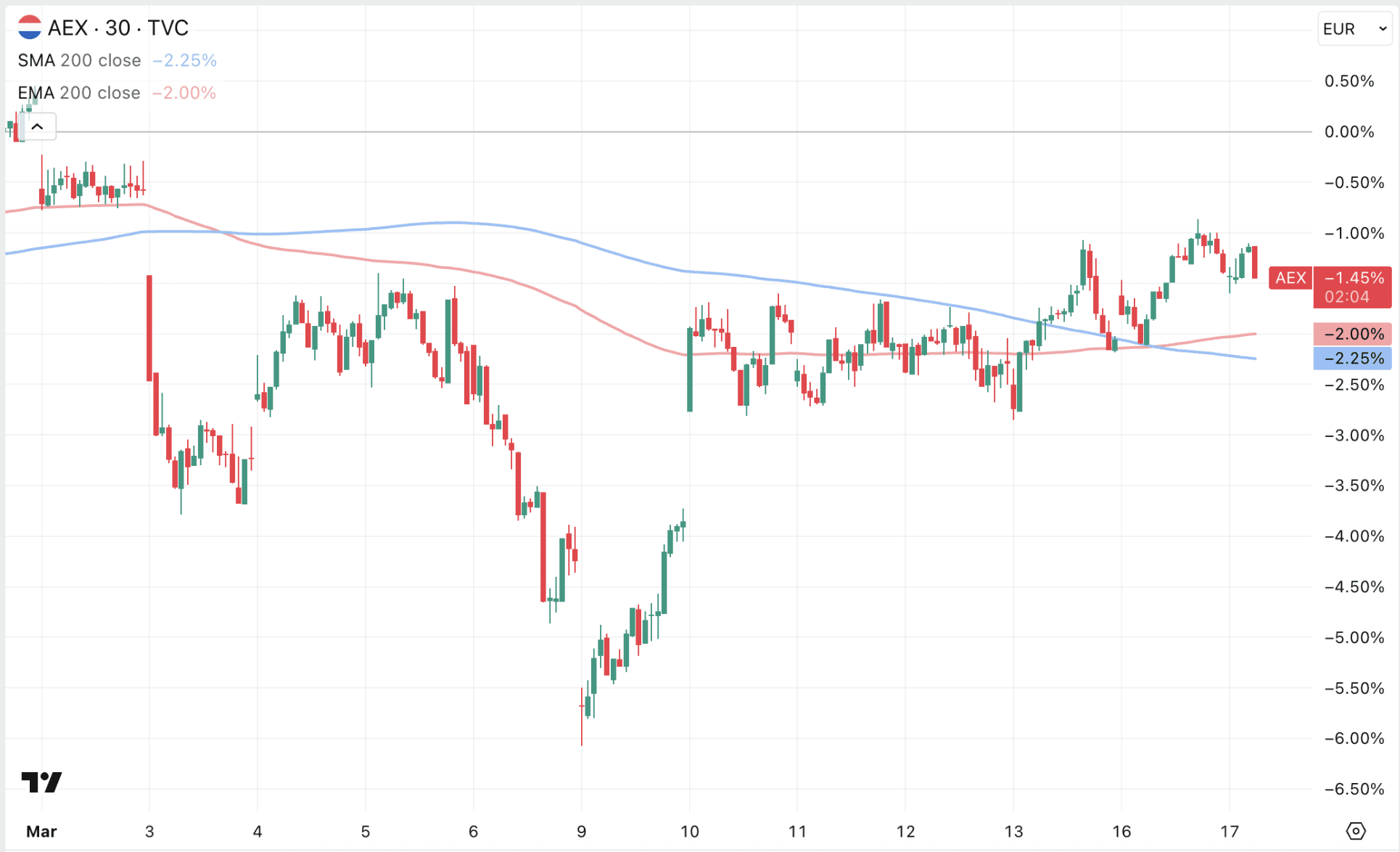 Sinds de start van het Iran-conflict is de AEX koers ongeveer 1,5 procent verloren. Op het dieptepunt ging het echter om een daling van 6 procent. Inmiddels is de beurs dus weer enigszins hersteld, terwijl de berichtgeving vanuit het Midden-Oosten vooral negatief blijft en wijst op verdere escalatie.