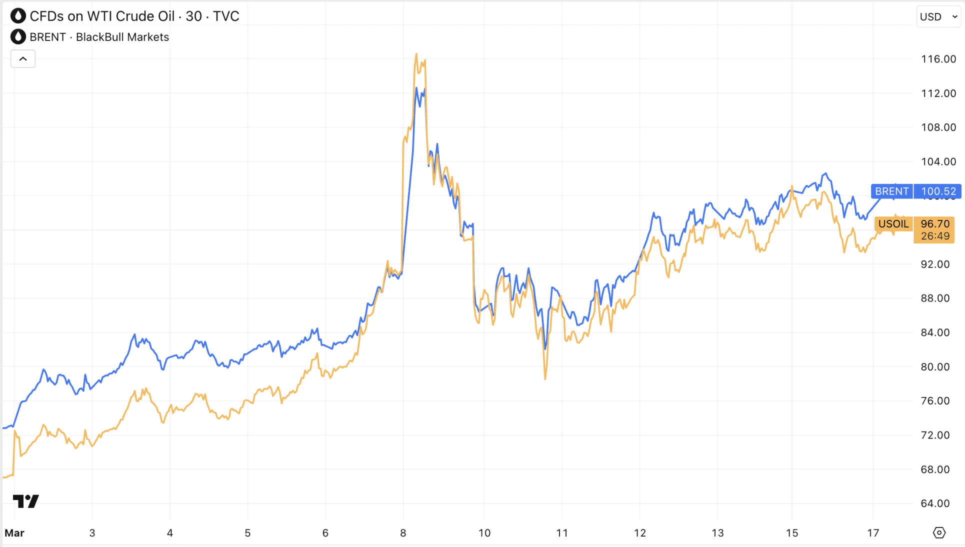 Sinds de start van het conflict is de olieprijs nog altijd fors gestegen. Ook vandaag staat er voor zowel Brent als WTI-olie weer een prijsstijging van enkele procenten op de borden.