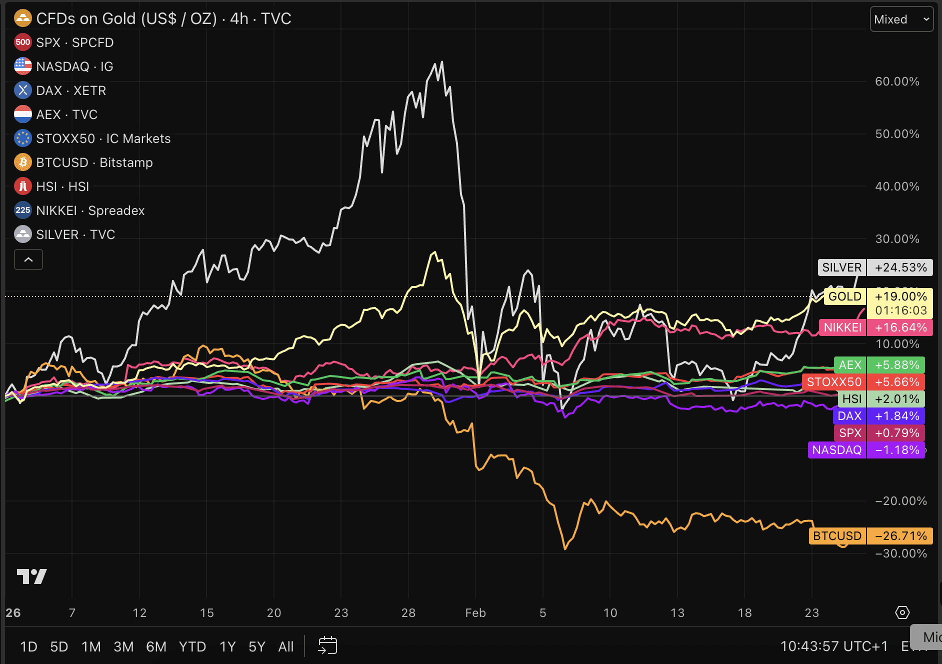 Alleen de Japanse Nikkei 225 doet het nog een stuk beter dan de AEX. Net zoals zilver en goud. Bitcoin daarentegen heeft het enorm zwaar en moet voor 2026 al een daling van ruim 26 procent noteren.