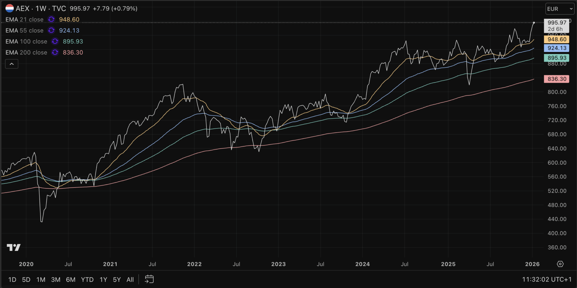 Als we naar de weekgrafiek van de AEX kijken, dan ziet alles er vooral positief uit. De beursindex handelt boven alle belangrijke exponentiële gemiddelden, terwijl ze ook nog eens in een zogenoemde “bullish-formatie” staan.