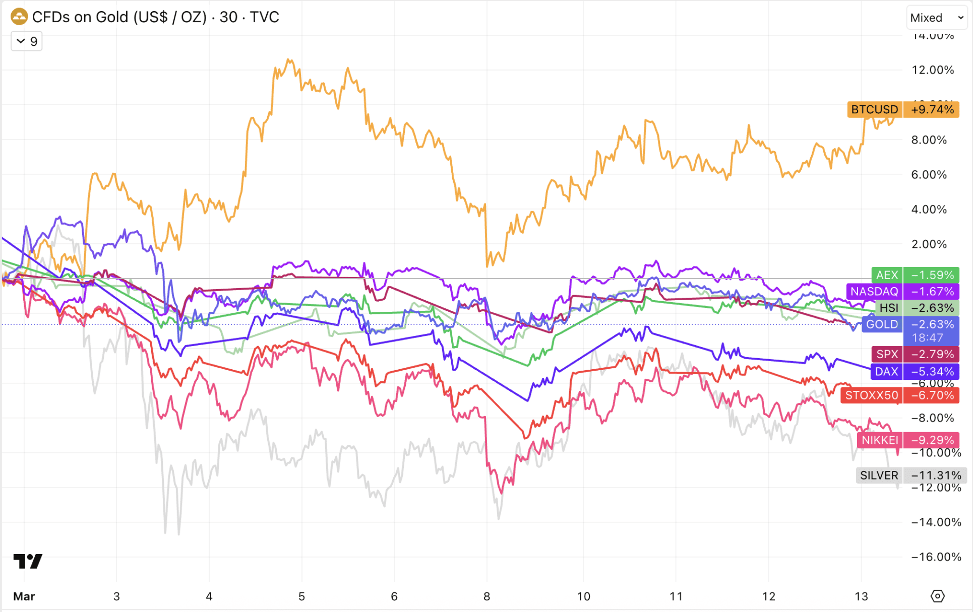 Het is de AEX nog niet gelukt om te ontsnappen aan de algehele malaise tijdens de Iran-oorlog. Voorlopig is het alleen Bitcoin dat zich weet te onttrekken aan de enorme koersdalingen op de financiële markt. Vanaf het begin van het conflict gemeten leverde de AEX 1,59 procent in. Daarmee presteert het wel beter dan de meeste grote beursindices.