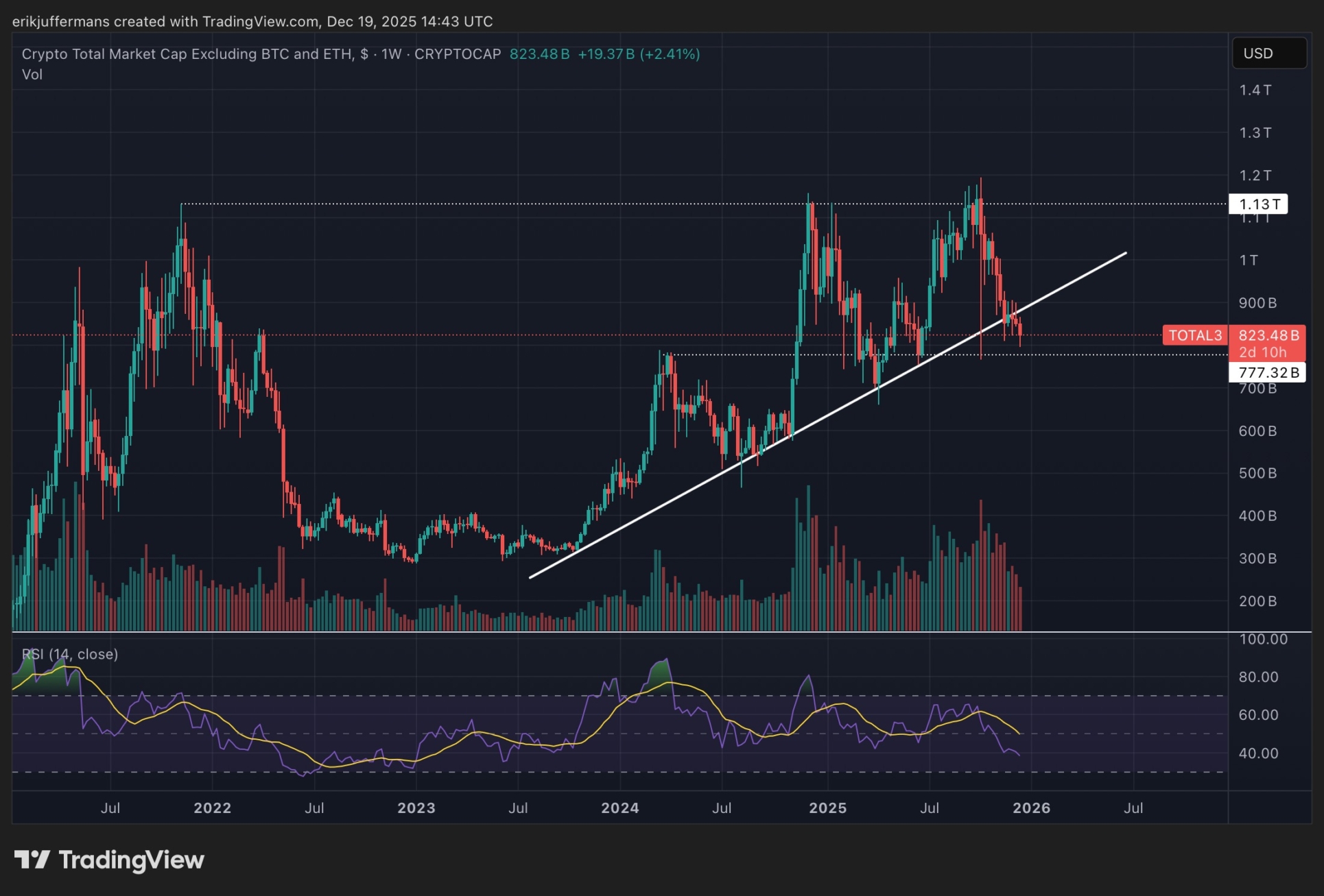 Hieronder zie je de wekelijkse TOTAL2 grafiek. We zien dat de waarde van altcoins een dubbele top vormde rond 1,13 biljoen dollar. Dit is exact hetzelfde niveau dat de TOTAL2 waarde in november 2021 tijdens de vorige bullmarkt bereikte. Wat dit echter laat zien is dat de totale waarde van alle altcoins deze cyclus niet echt een grote stijging hebben gemaakt ten opzichte van de piek in 2021. Het was daarmee vooral Bitcoin dat deze cyclus in de schijnwerpers stond.
