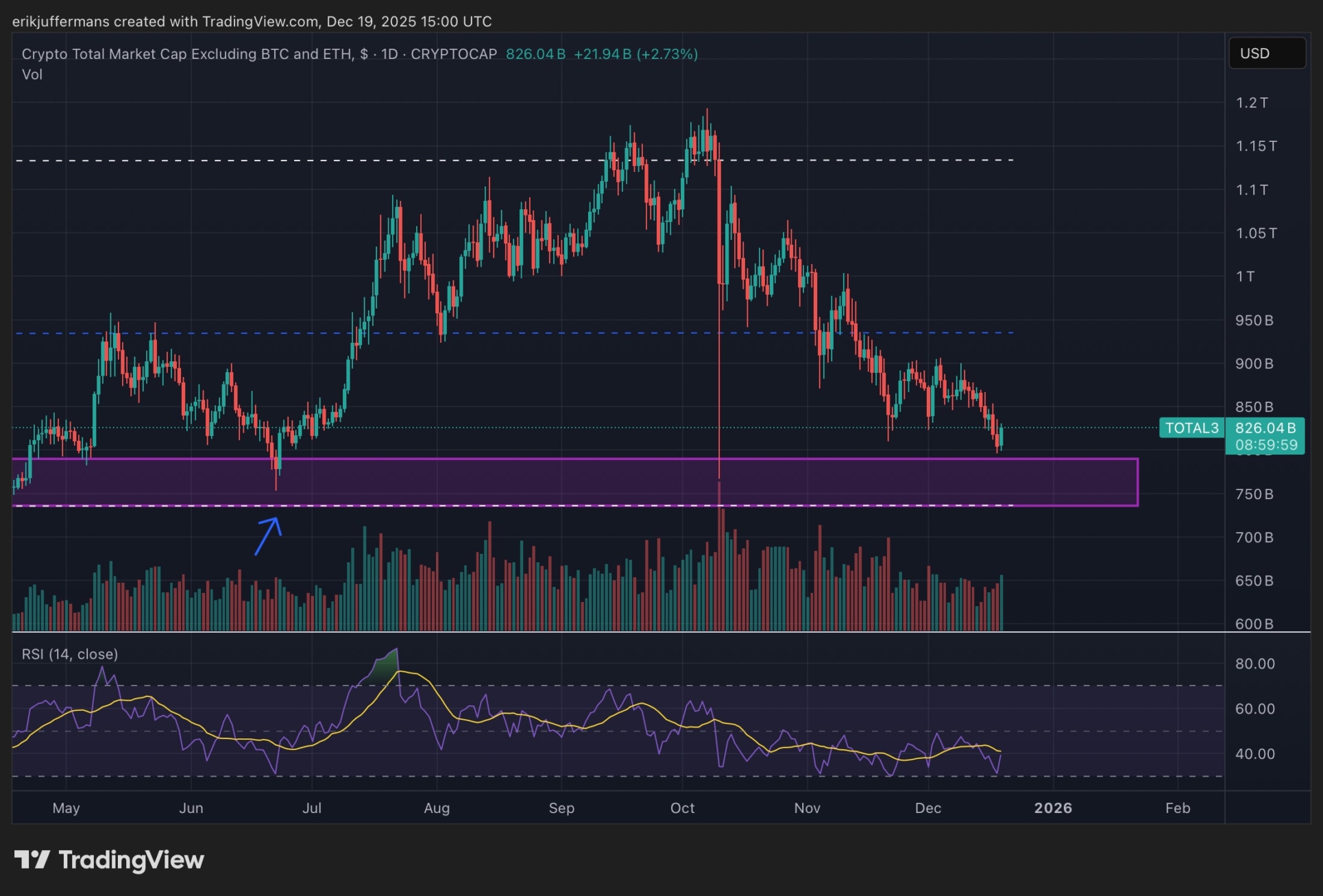 En er is een sterk signaal dat wijst op een mogelijke bounce. Op de eerste grafiek, de wekelijkse TOTAL2 grafiek, is sprake van sterke bullish divergence. Dit gebeurt wanneer RSI indicator (onderaan de grafiek) een lagere low noteert terwijl de koers een hogere low noteert. Op de wekelijkse grafiek zien we dit nu gebeuren. En zeker wanneer dit op een wekelijks timeframe gebeurt, is dit een sterk signaal.