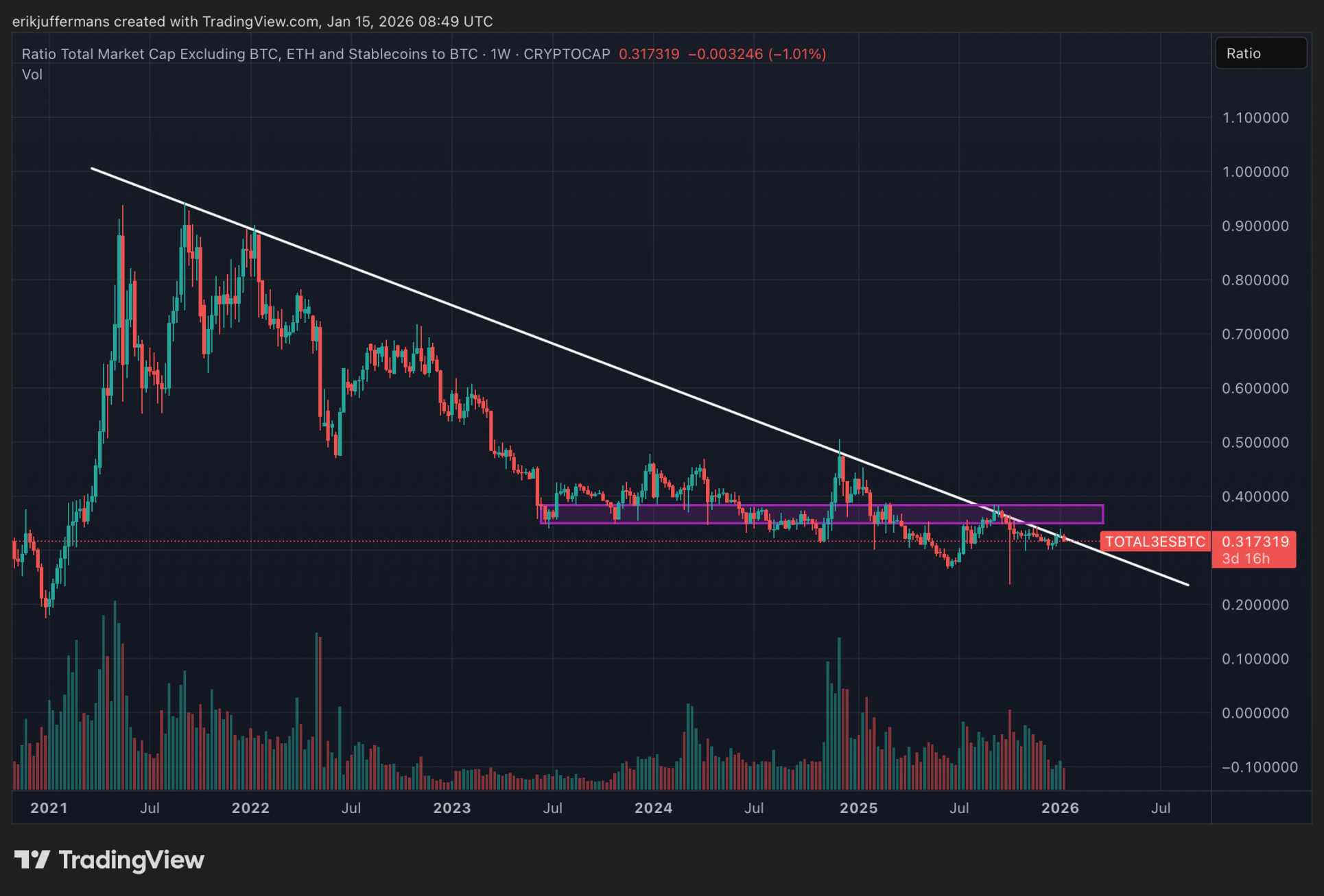 Als je de TOTAL3ES waarde afzet tegen de waarde van Bitcoin dan krijg je een waarde. Deze waarde wordt weergegeven in de TOTAL3ES/BTC grafiek. En op deze grafiek gebeurt momenteel iets heel interessants.