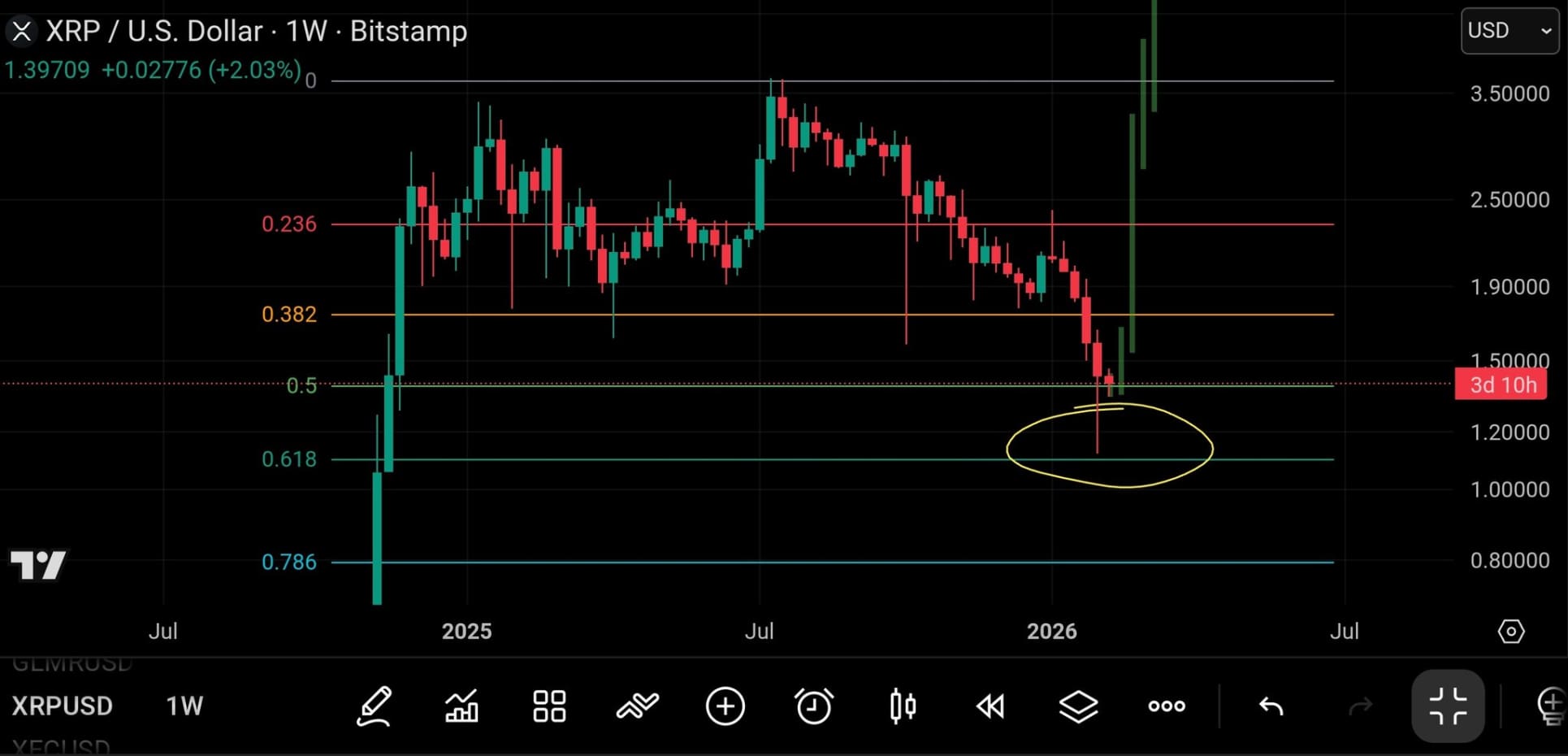 Op de grafiek is te zien hoe een diepe wick het 0.618-niveau aantikt, waarna de weekkaarsen hoger sloten en een groen signaal gaven. Volgens XRP Captain vormt dit gebied een ‘cluster’ van prijsactie: een zone waar de koers stabiliseert en koopinteresse toeneemt. Die combinatie zou erop kunnen wijzen dat de lokale bodem inmiddels is bereikt.