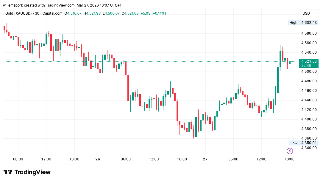 Op de grafiek is te zien dat goud recent nog rond de 4.350 dollar handelde, maar inmiddels stevig is opgeveerd richting de 4.500 dollar. Daarmee herstelt de markt een groot deel van de eerdere verliezen.