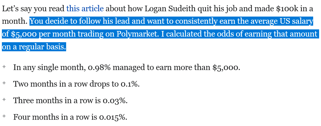 Volgens de analyse verdient bijna 1 procent van de Polymarket-traders in een losse maand meer dan 5.000 dollar. Dat klinkt indrukwekkend, maar het beeld verandert volledig zodra je kijkt naar consistentie.
