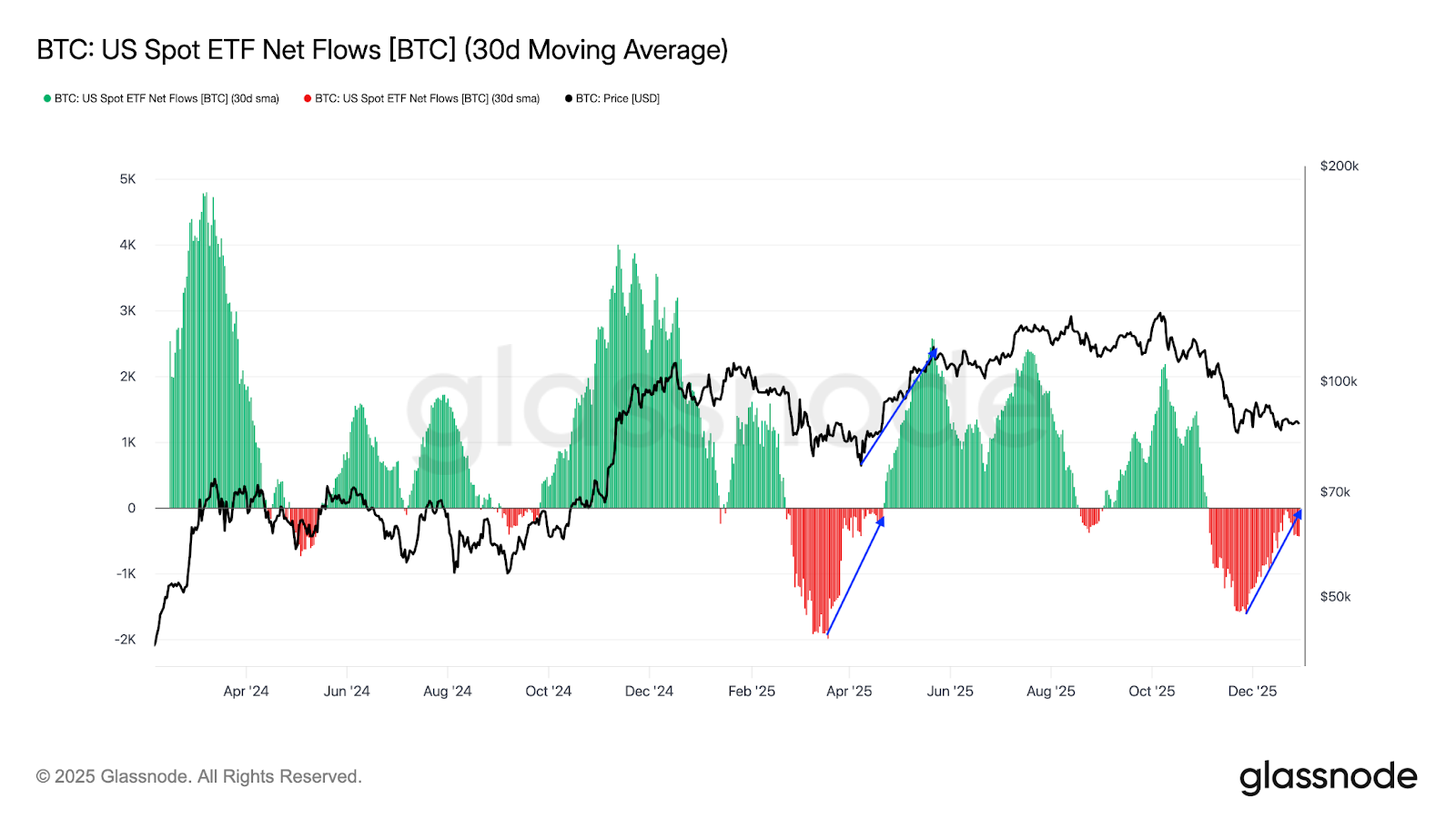 Naast seizoenspatronen wijzen onchain- en flowdata op afnemende neerwaartse druk. De uitstroom uit de Bitcoin ETF’s is de afgelopen weken sterk afgekoeld en beweegt richting nul. Eerdere periodes waarin ETF-uitstroom opdroogde, gingen vooraf aan stevige herstelrally’s.
