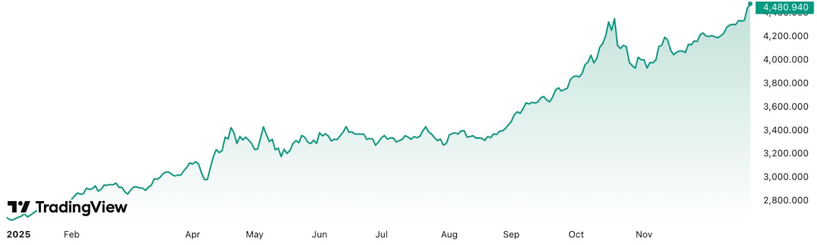 De goudprijs bereikte eerder vandaag een piek van 4.497 dollar per ounce. Inmiddels is de koers iets teruggezakt naar 4.483 dollar, maar blijft uitzonderlijk hoog. Sinds begin dit jaar is de goudprijs met maar liefst 71 procent gestegen, waarmee 2025 het sterkste jaar is sinds 1979.