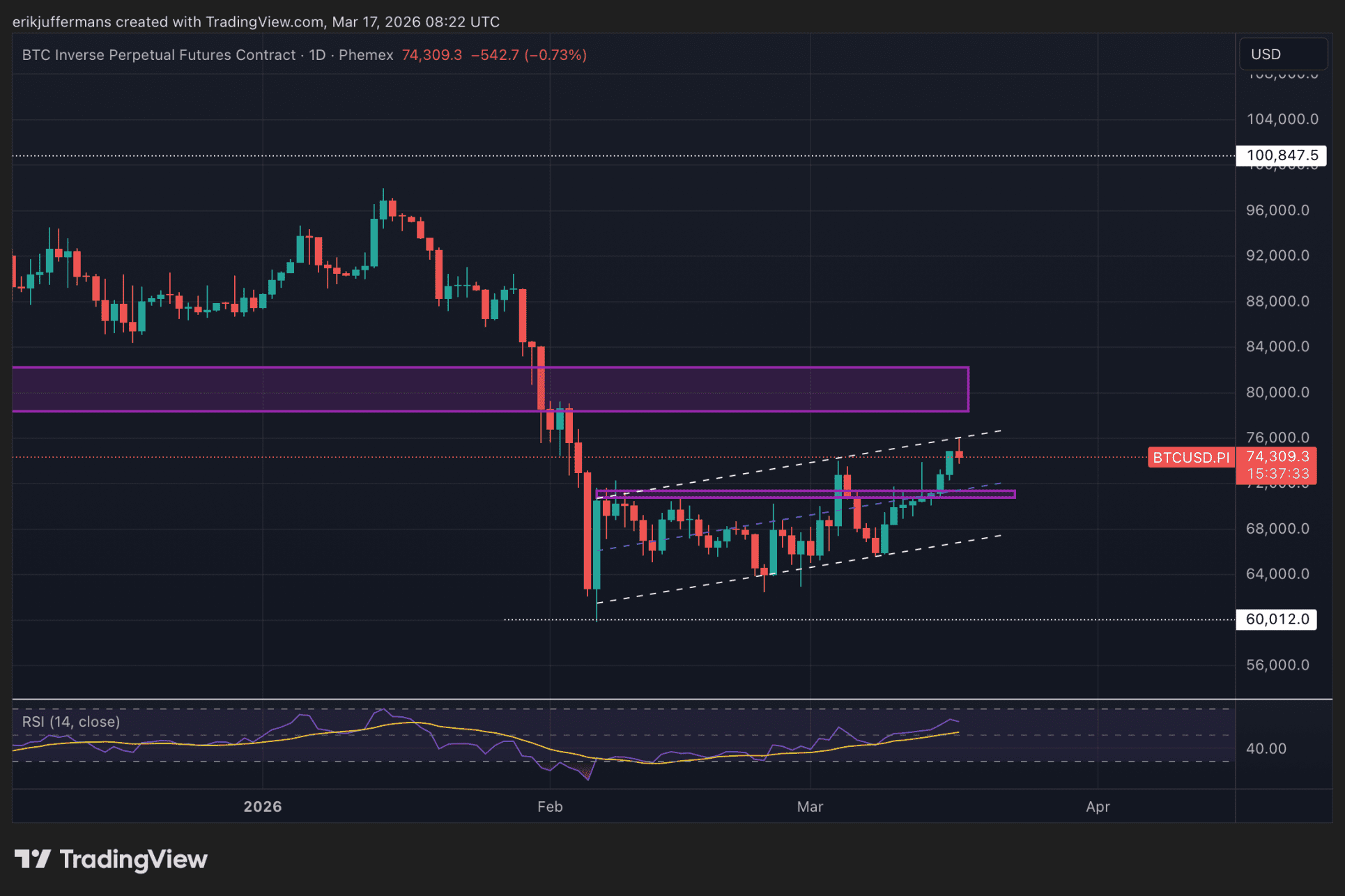 Bitcoin stijgt richting 75.000 dollar terwijl oorlog met Iran markten raakt en olie explodeert, maar analisten waarschuwen dat deze rally kwetsbaar blijft
