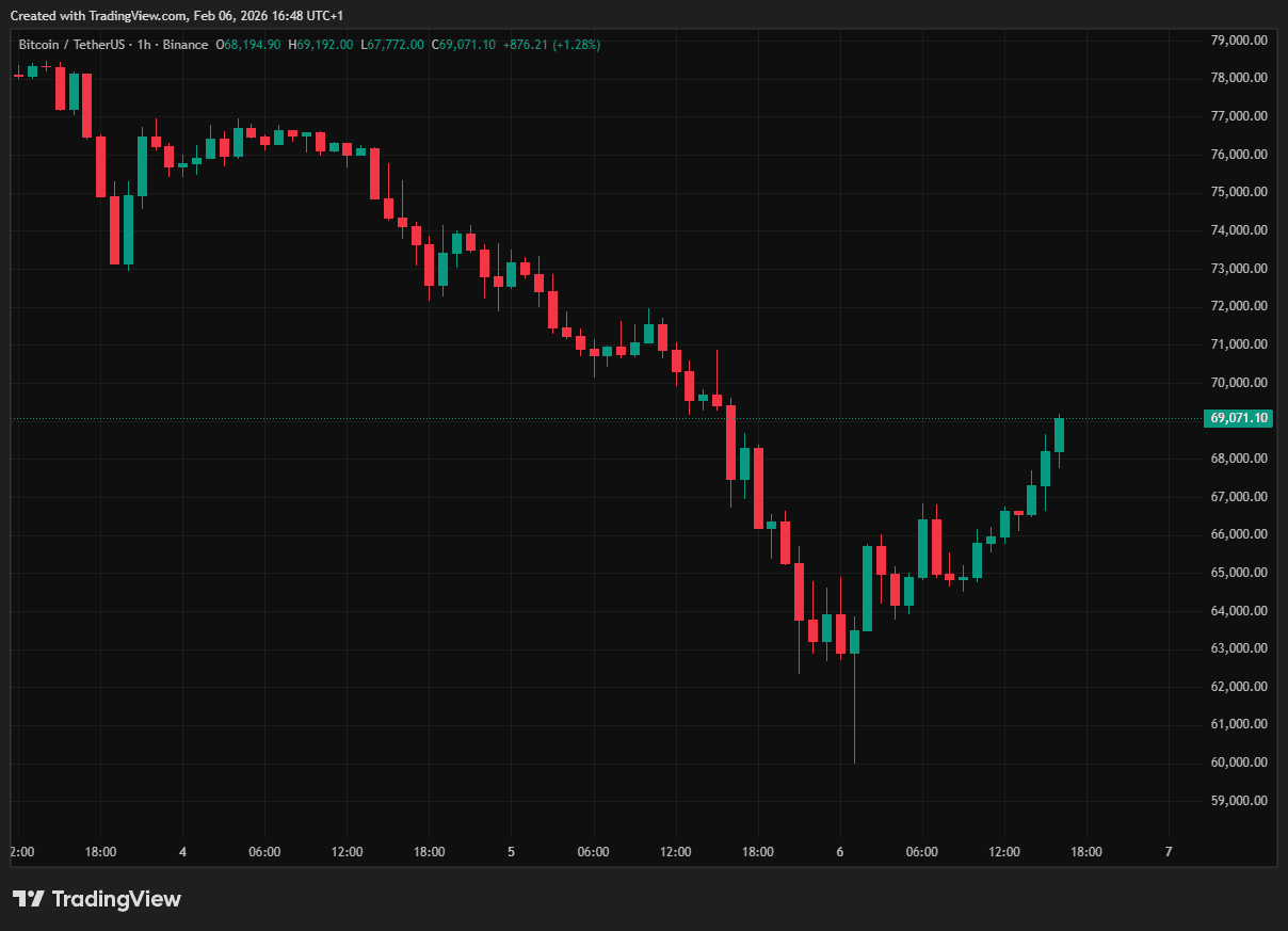 Bitcoin (BTC) steeg vrijdag met bijna acht procent naar ruim 69.000 dollar. Daarmee wist de cryptomunt ongeveer de helft van de verliezen van donderdag goed te maken. Die daling was de grootste sinds de ondergang van het cryptoplatform FTX.