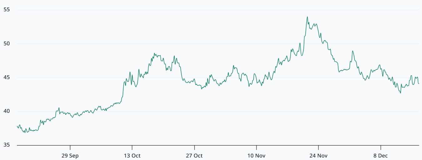 De Implied Volatility van Bitcoin piekte in november bijvoorbeeld op 53 procent. Dat is de verwachtingen die handelaren op de optiemarkt hebben over de volatiliteit van de Bitcoin koers. Dus de mate waarin de koers zal bewegen.