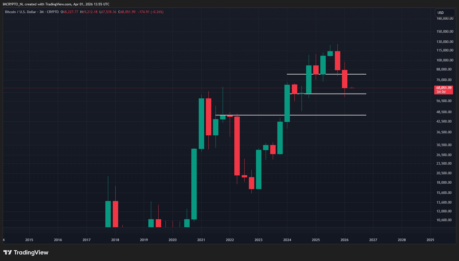 Als we de kwartaalgrafiek erbij pakken, dan zien we dat de BTC koers zich precies tussen twee belangrijke levels bevindt. Dat zijn grofweg 62.000 dollar aan de onderkant en 82.000 dollar aan de bovenkent.