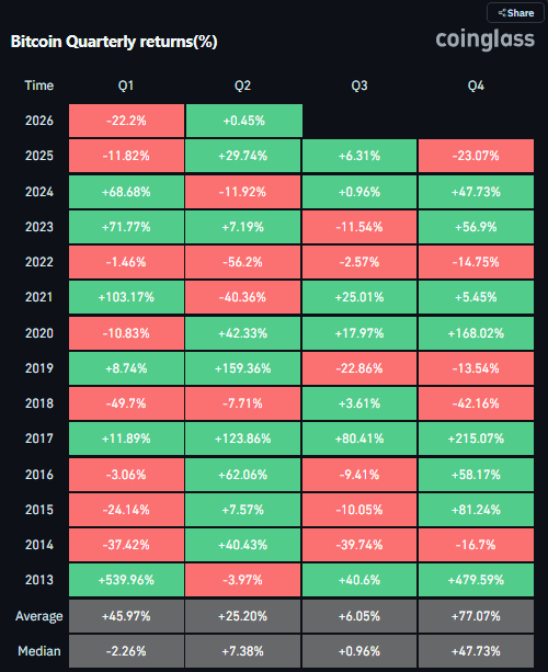 De historische gegevens van CoinGlass laten zien dat Bitcoin sinds 2013 slechts drie slechtere eerste kwartalen heeft gehad. In 2014 ging de koers met 37,42 procent onderuit, in 2015 met 24,14 procent en in 2018 met 49,7 procent.