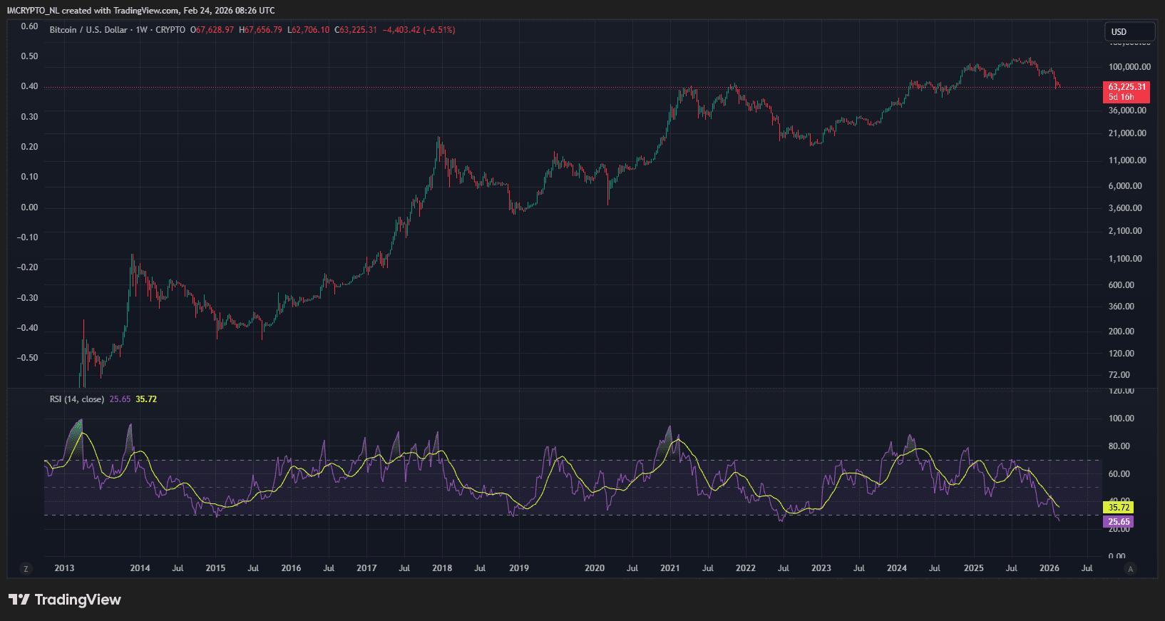 Momenteel zien we op de wekelijkse grafiek een RSI van minder dan 26. Om precies te zijn van 25.61. In Bitcoin’s hele bestaan is de RSI maar één keer lager binnengekomen dan dit. Dat was in juni 2022.