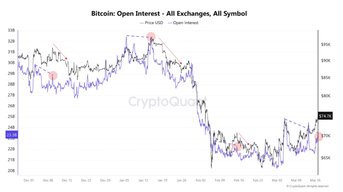 De zogenoemde open interest (OI) lijkt signalen van een dalende trend te geven. Zie daarvoor de paarse lijn in de onderstaande grafiek.