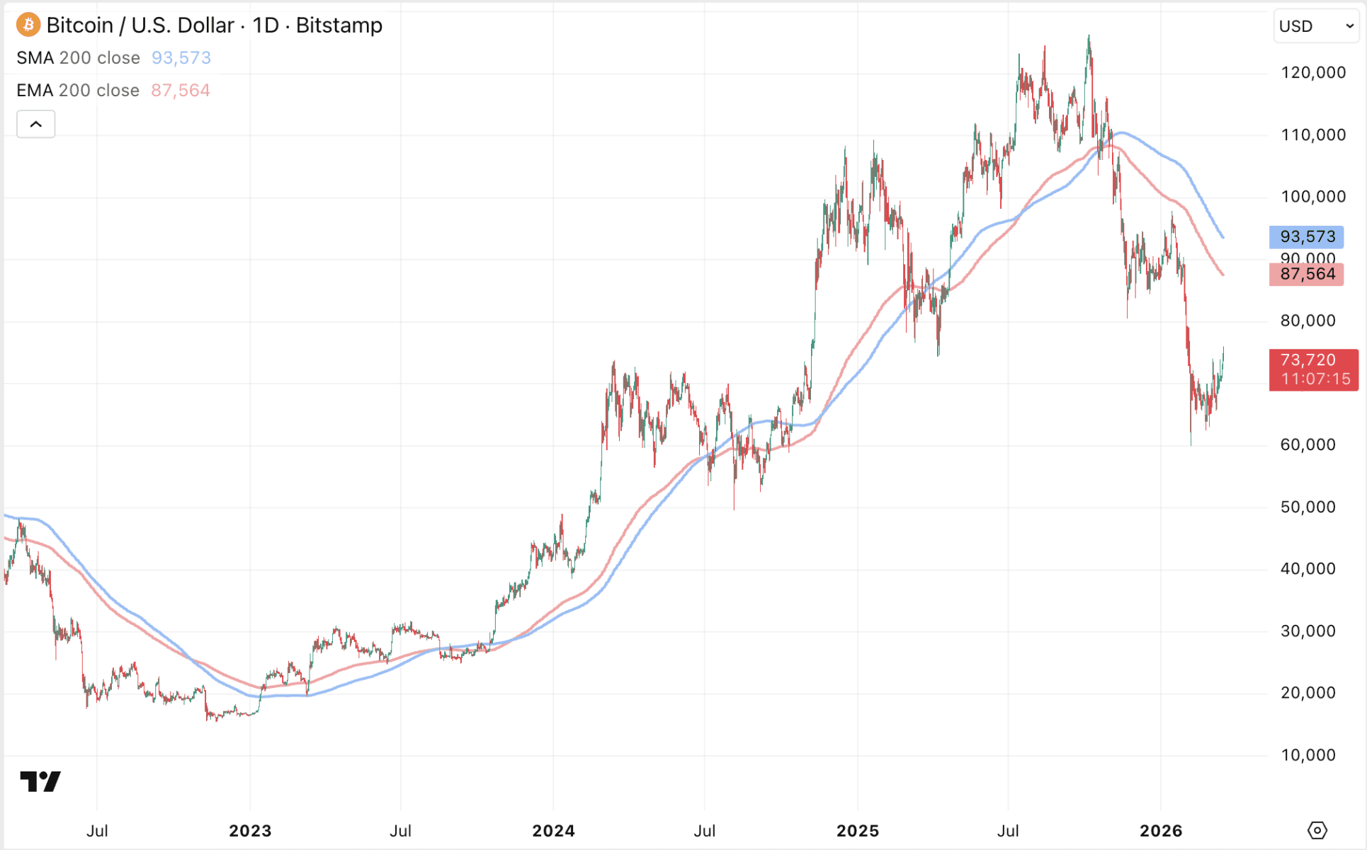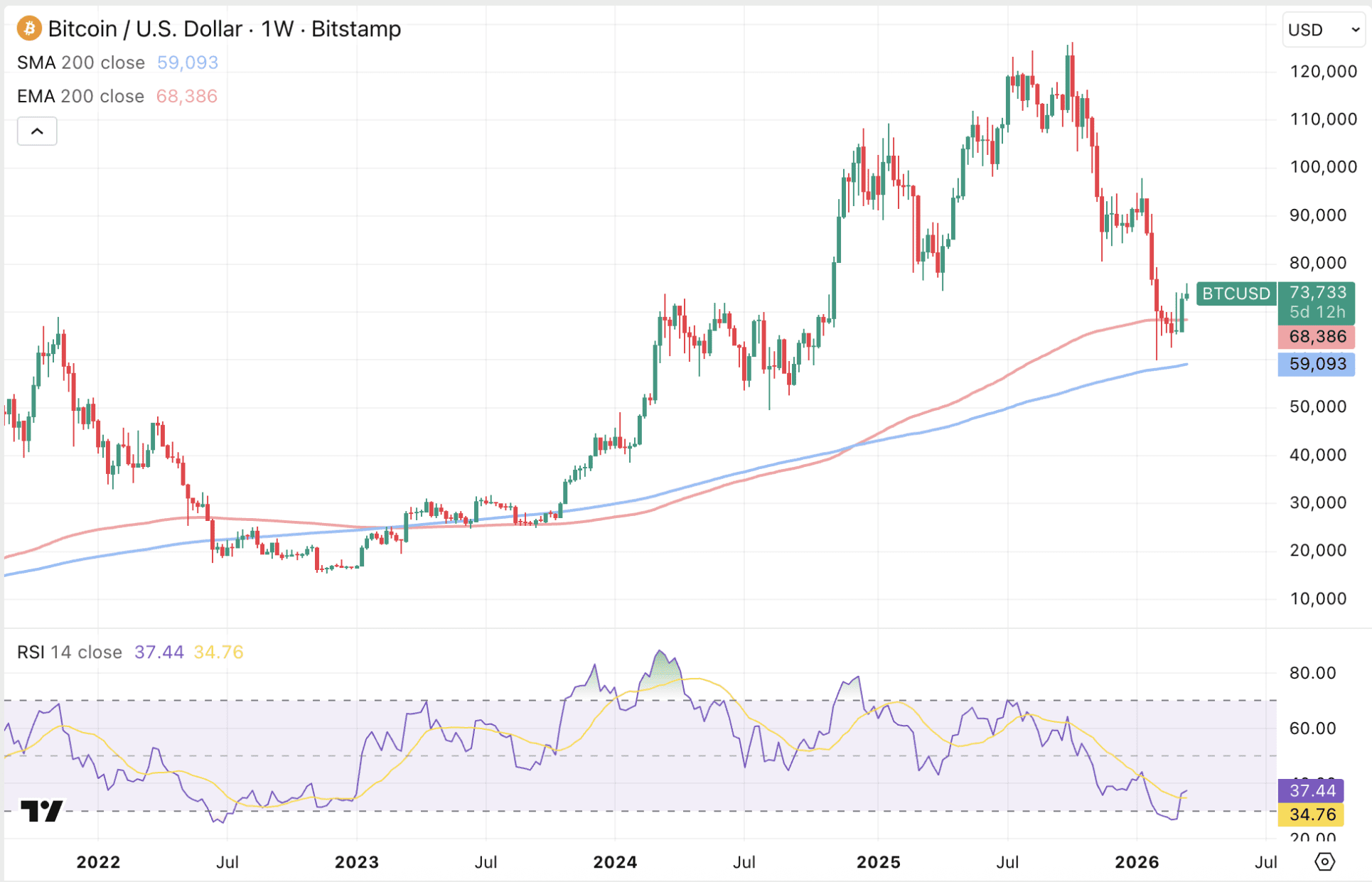 Voor nu moet Bitcoin om dat te realiseren klimmen naar 87.564 tot 93.573 dollar. Vanaf de huidige koers van 73.720 dollar is er dus nog een lange weg te gaan.
