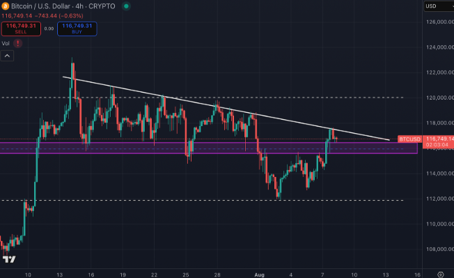Bitcoin (BTC) heeft de belangrijke weerstand op 115.000 dollar doorbroken en beweegt richting het volgende technische doel op 118.000 dollar.