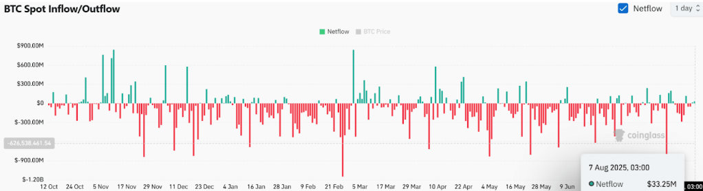 Uit data van CoinGlass blijkt dat er op 7 augustus een positieve spot-netflow van 33,25 miljoen dollar werd geregistreerd, waarmee een periode van netto-uitstroom werd doorbroken. Dit kan wijzen op hernieuwde koopinteresse, maar dergelijke instromen gaan niet altijd samen met verdere koersstijgingen. Historisch gezien worden grotere, duurzame rally’s vaak ondersteund door een combinatie van oplopende netwerkactiviteit en constante kapitaalinstroom.