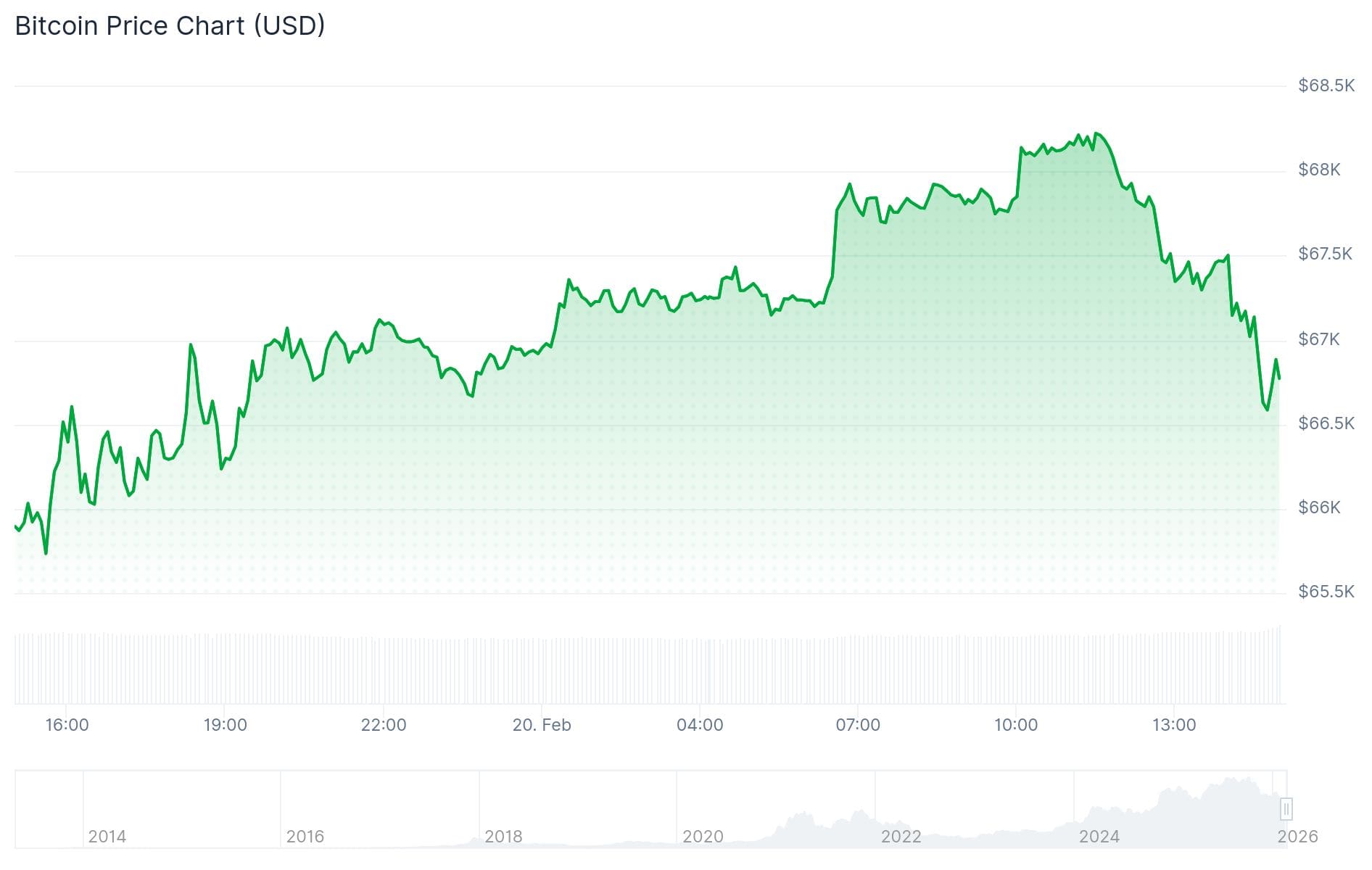 De Bitcoin koers was vanmorgen gestegen van 67.200 dollar naar 68.300 dollar, maar op het moment van publicatie stond het op zo’n 67.000 dollar. Daarna daalde het naar een dieptepunt van 66.300 dollar. In dit artikel lees je wat de belangrijkste niveaus zijn om in de gaten te houden.