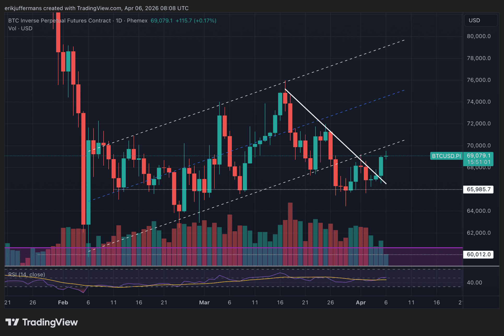 Op de 4-uursgrafiek is te zien dat BTC gisteravond krachtig steeg richting 69.000 dollar. Ook werd dit weekend de neerwaartse trendlijn doorbroken. Dat zorgt voor voorzichtig optimisme onder beleggers.