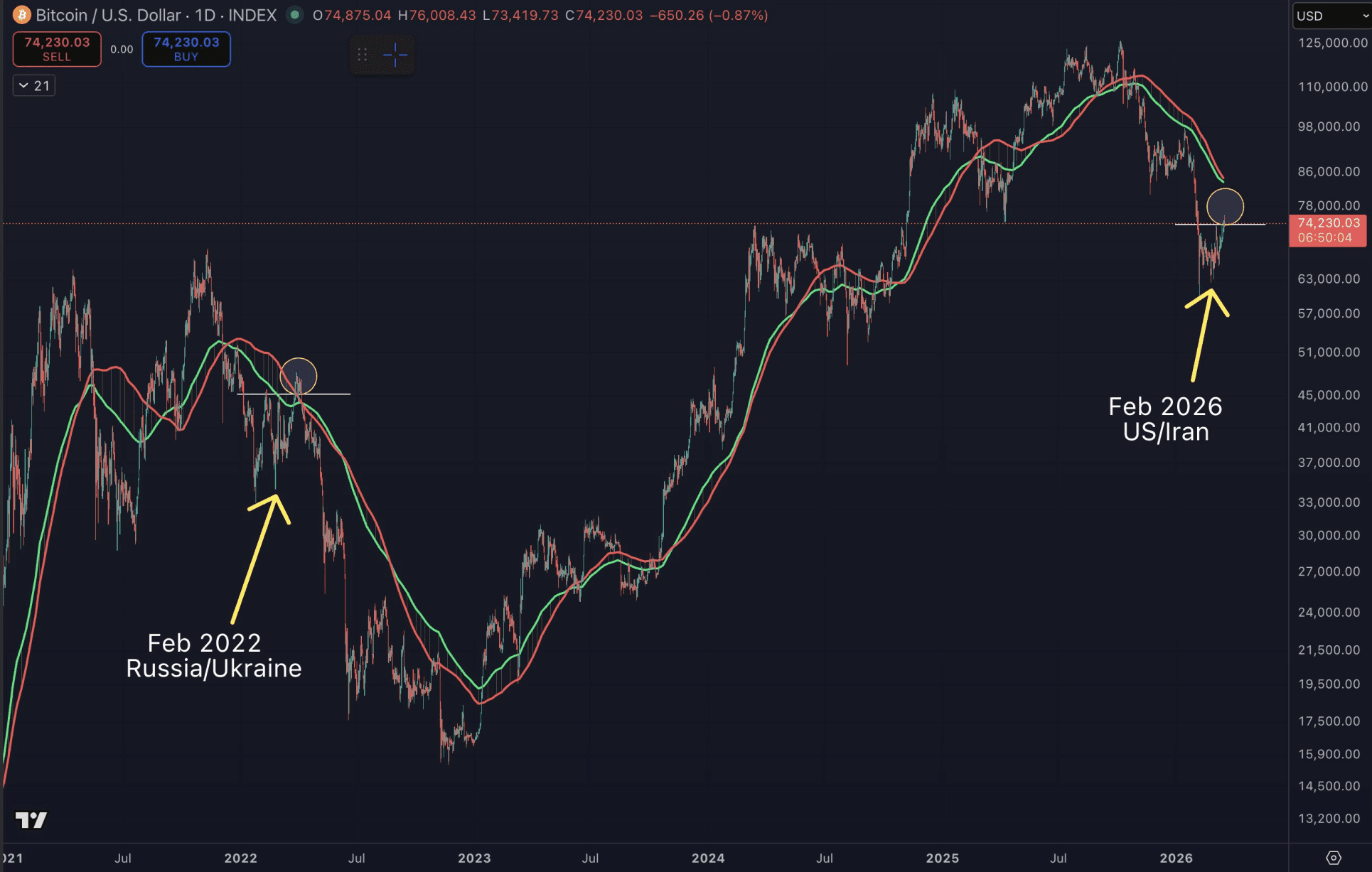 Bitcoin kende destijds een korte opleving, zoals we dat ook zien gebeuren tijdens de eerste weken van het Iran-conflict. Als we een herhaling van 2022 krijgen, dan kunnen de komende weken weleens heel pijnlijk worden voor de Bitcoin koers.