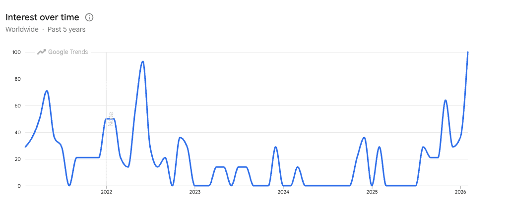 Volgens Google Trends zoeken mensen de afgelopen dagen opvallend vaak op “Bitcoin going to zero”. Een vergelijkbare piek was voor het laatst te zien rond de paniek na de FTX-crash in november 2022, toen veel handelaren vreesden dat het vertrouwen in crypto blijvend was beschadigd.