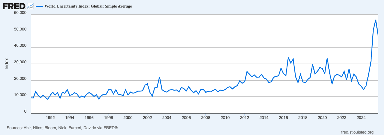 Ook de timing speelt mee. De wereldwijde onzekerheid over economie en geopolitiek loopt volgens de World Uncertainty Index op tot het hoogste niveau in de reeks van de St. Louis Fed. Bedrijven stellen in zulke periodes vaker investeringen en nieuwe banen uit, wat de vrees voor tegenvallende groei voedt.