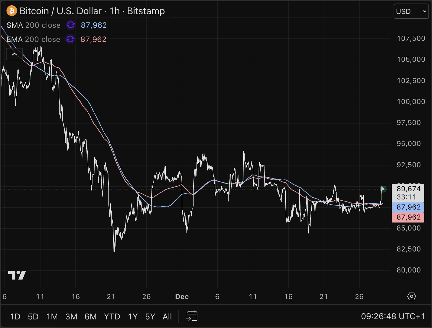 Bitcoin handelt momenteel grofweg tussen 85.000 en 92.000 dollar. Dat zijn prijszones waar in het verleden veel handel plaatsvond, wat ze technisch relevant maakt. De onderkant van de range fungeert als steun, terwijl de bovenkant steeds vaker wordt gebruikt om posities af te bouwen.