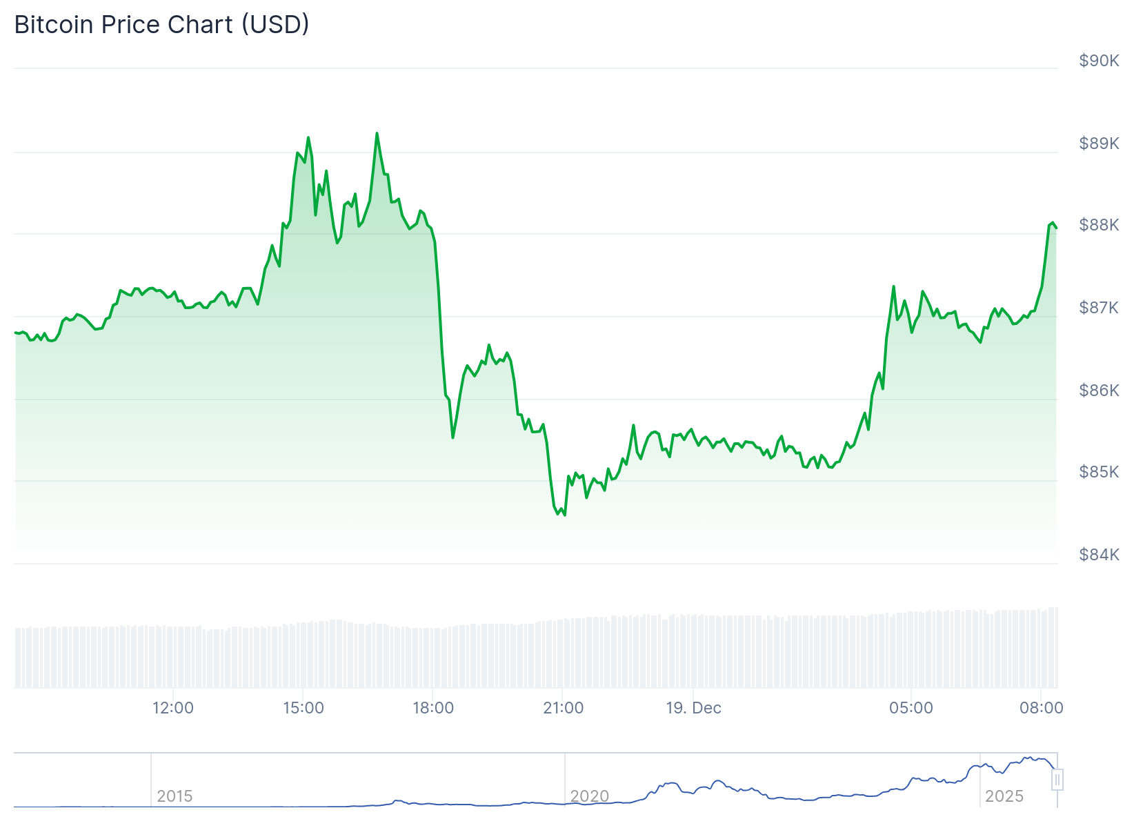 Bitcoin (BTC) reageerde wel direct: de koers steeg van 85.200 dollar naar 88.100 dollar.