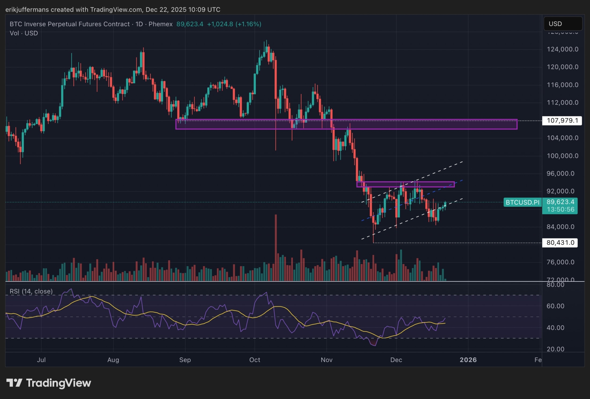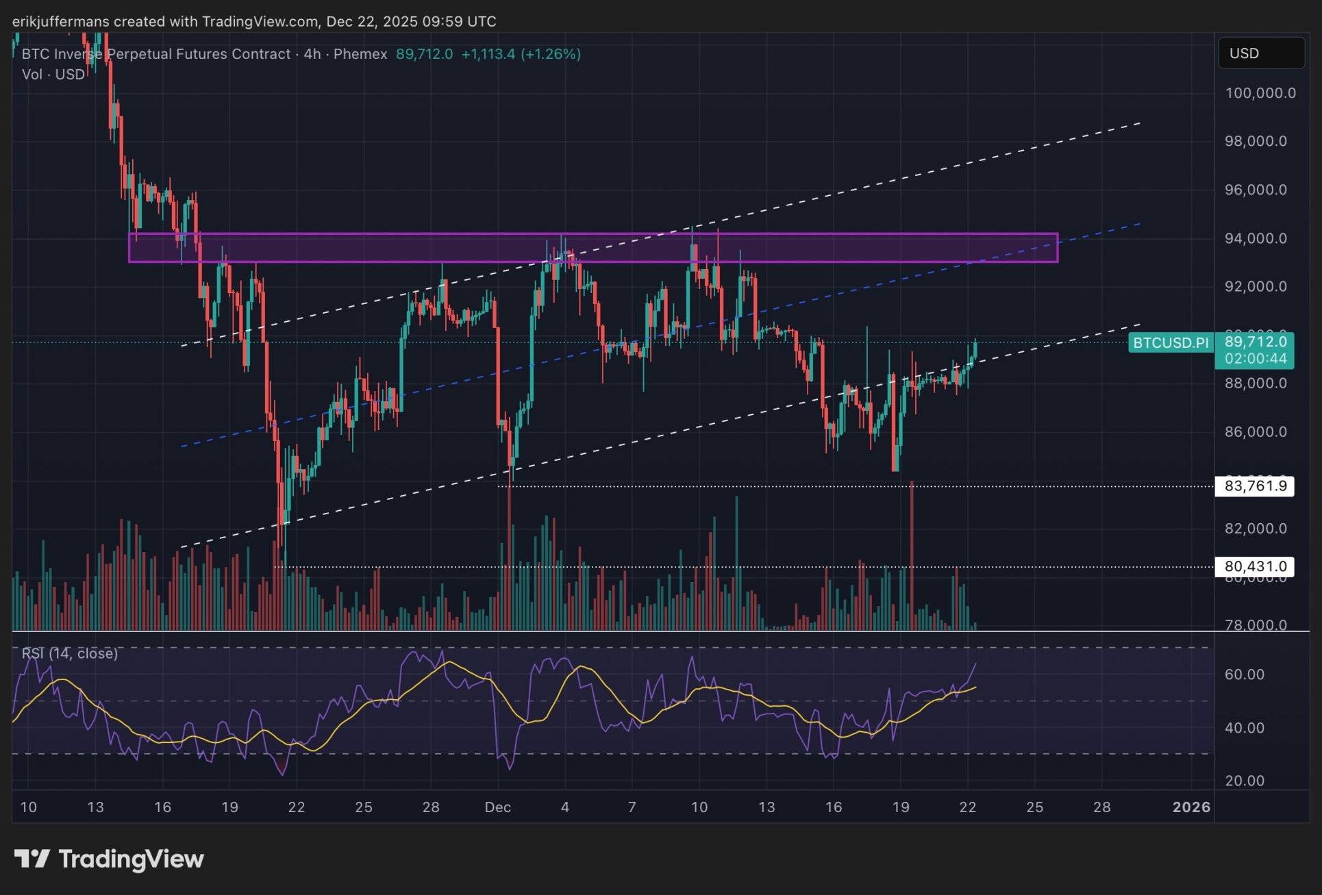 De koers start de week zoals gezegd sterk. Met de huidige stijging richting 90.000 dollar is de koers weer tot in een opwaarts kanaal terechtgekomen dat eerst juist werd verloren. Dit is te zien op de 4-uursgrafiek hieronder. We moeten echter niet te vroeg juichen. De zone rond 90.000 fungeert als sterke weerstand en de uiteindelijke test boven 93.000 is waar het echt om draait.