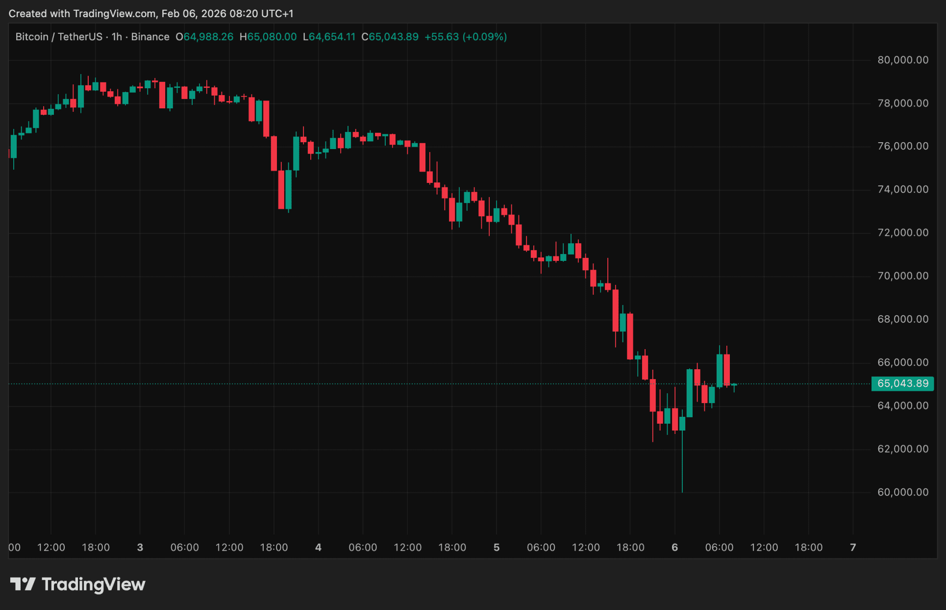 Bitcoin (BTC) dook in de nacht naar een nieuw dieptepunt van ongeveer 60.000 dollar. Daarmee verloor de munt bijna de helft van zijn waarde ten opzichte van de piek begin oktober. Kort daarna volgde een krachtige opleving: binnen enkele uren steeg de Bitcoin koers met bijna zes procent tot boven de 66.000 dollar. Inmiddels is die winst deels verdampt en schommelt de koers rond 65.000 dollar.