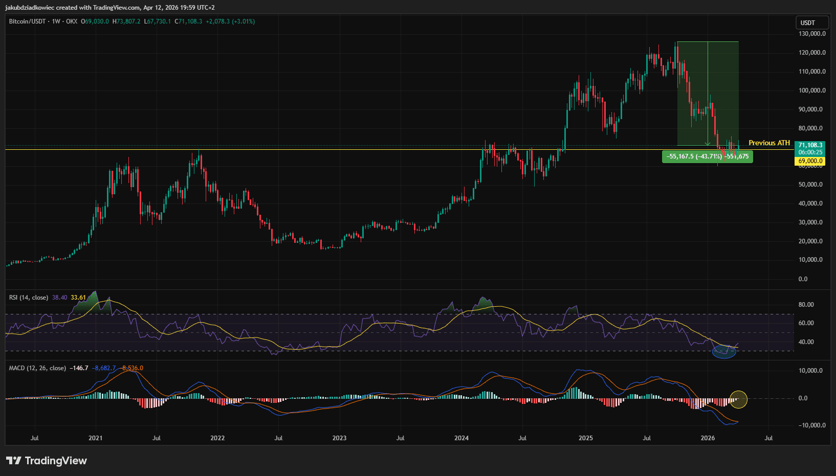 Tegelijk oogt het technische beeld niet volledig hopeloos. Op weekbasis nadert de RSI opnieuw oversold terrein en probeert de MACD een eerste voorzichtige bullish draai te maken. Dat zijn signalen die vaker verschijnen wanneer de ergste verkoopdruk begint uit te doven.