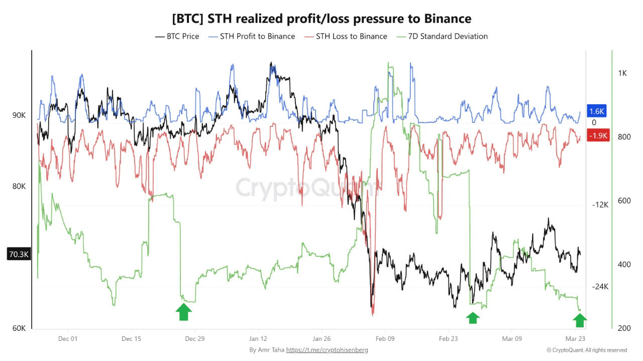 Ook bepaalde on-chain indicatoren wijzen op een mogelijke opleving. De volatiliteit in winst- en verliesnemingen onder kortetermijnbeleggers op Binance is gedaald naar niveaus die eerder voorafgingen aan rallies van ongeveer 10 tot 14 procent.