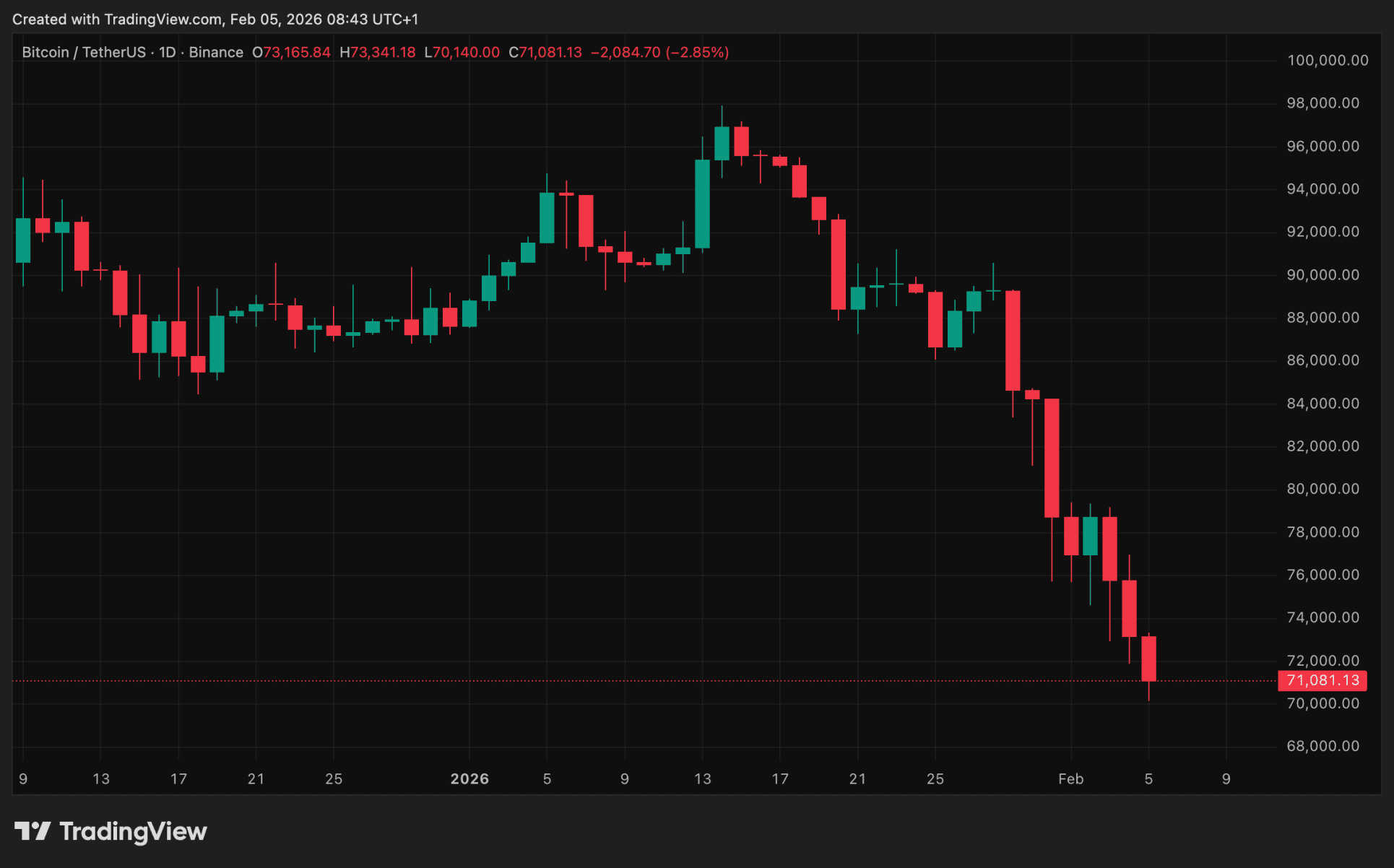 De Bitcoin koers zit in een vrije val en bereikt nu voor het eerst sinds november 2024 de $70.000. Een heel belangrijk niveau is nu dichtbij.